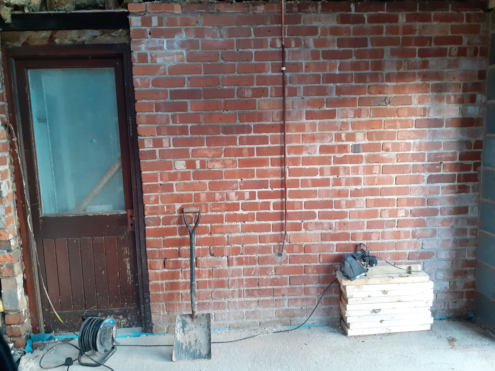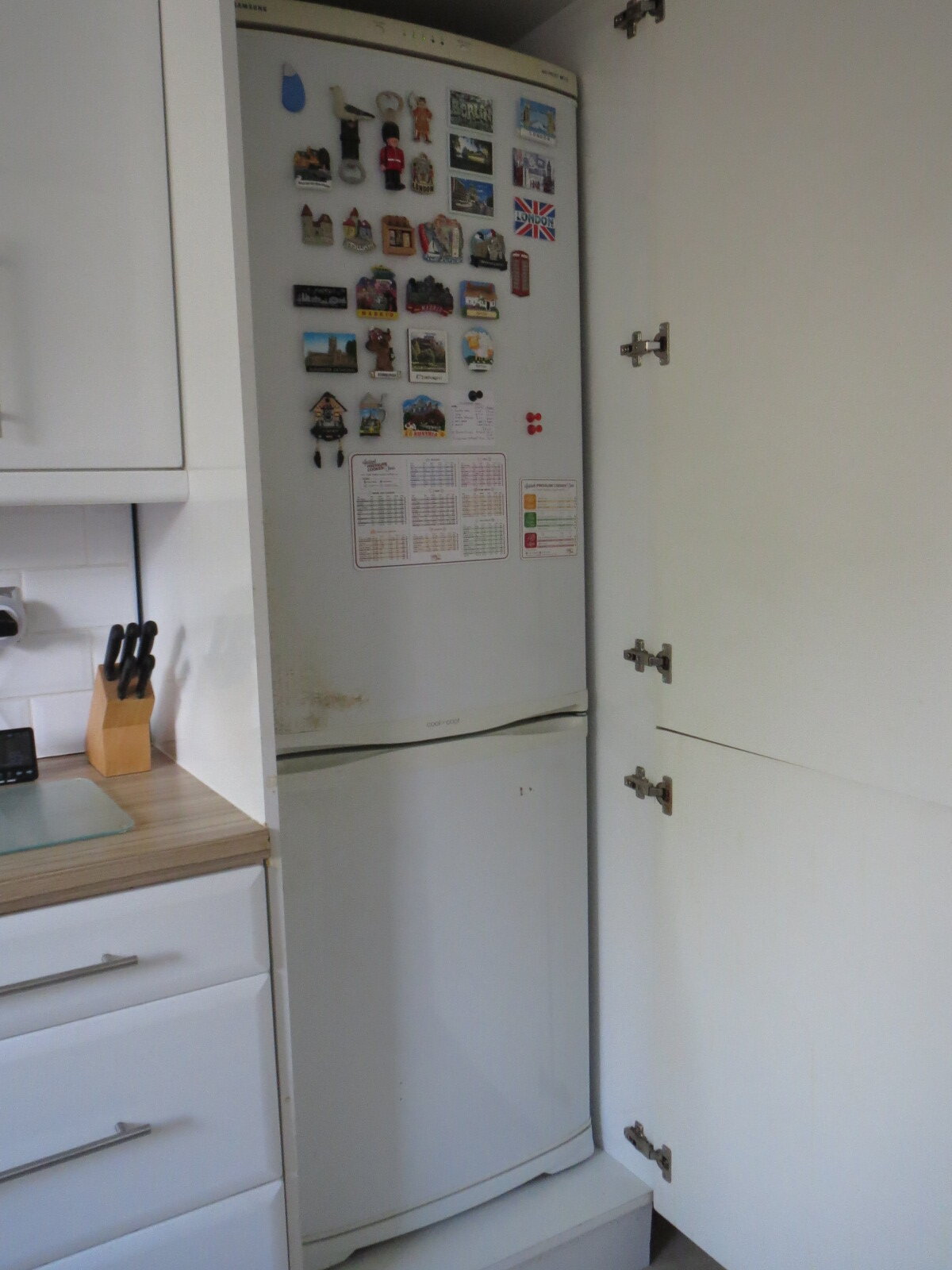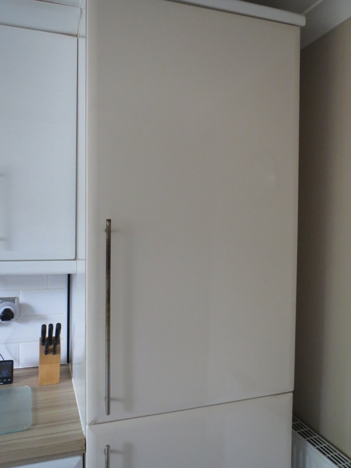 The existing kitchen extension the new garden room was built onto, had an external door that was not bricked up. The fridge is backed right up against that external door, which was just covered over with plasterboard in the new room. The kitchen cabinetry forms a kind of accoustic soundbox around the fridge.