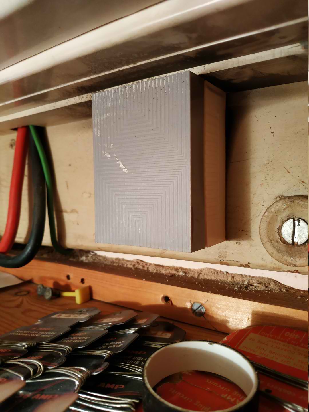 Title says it all, really. There is a small grey plastic unit under the fuse box, as per attached photos. It is very warm and there is some blackening behind it on the wood panel it's fitted upon.What might this unit be and what should I do about it?