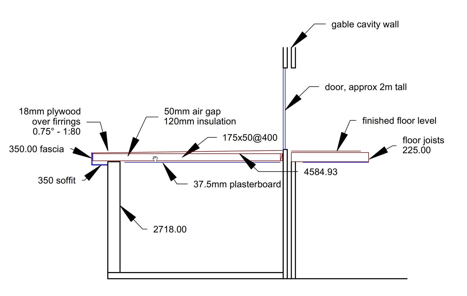 The flat roof has not been constructed yet and the door has not been ordered. The opening is about 1m wide by 2m tall.
