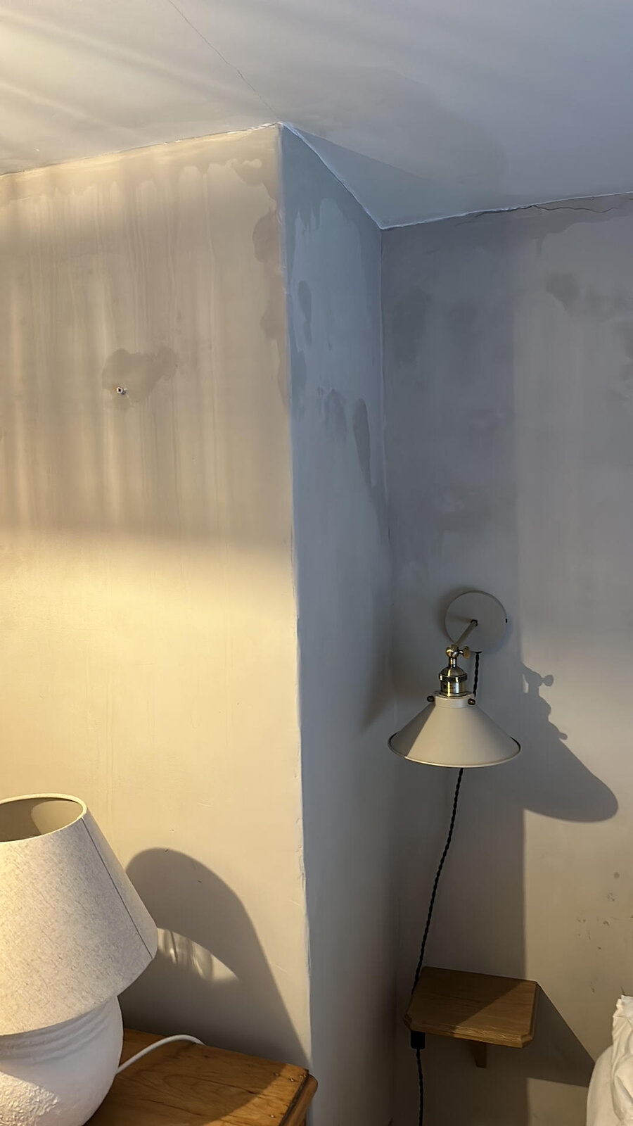 We thought maybe the patches on the walls (and a surveyor we contacted who didnt end up coming out just told us this was likely what the patches were) was the lime plaster chemically reacting to historic soot of the chimney breast (this was sweeped out in 2020 also before the renovation works) rather than a leak or penetrating damp but now wondering if this was incorrect.
