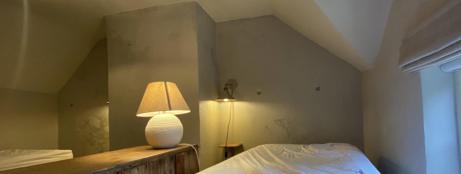 We have decorative brickwork on a gable end period cottage. In 2020 a total renovation was carried out. As part of this a new chimney stack was built, the original roof tiles were taken off, and a new roof membrane laid with the original tiles put back on, lead around stack. The brickwork on gable end was all repointed with a lime mortar. Inside the old plaster was mostly hacked off and the bedroom was then lime plastered. It has always had a little bit of damp evident on patches which come and go which in the last couple of weeks has got significantly worse due to rain.