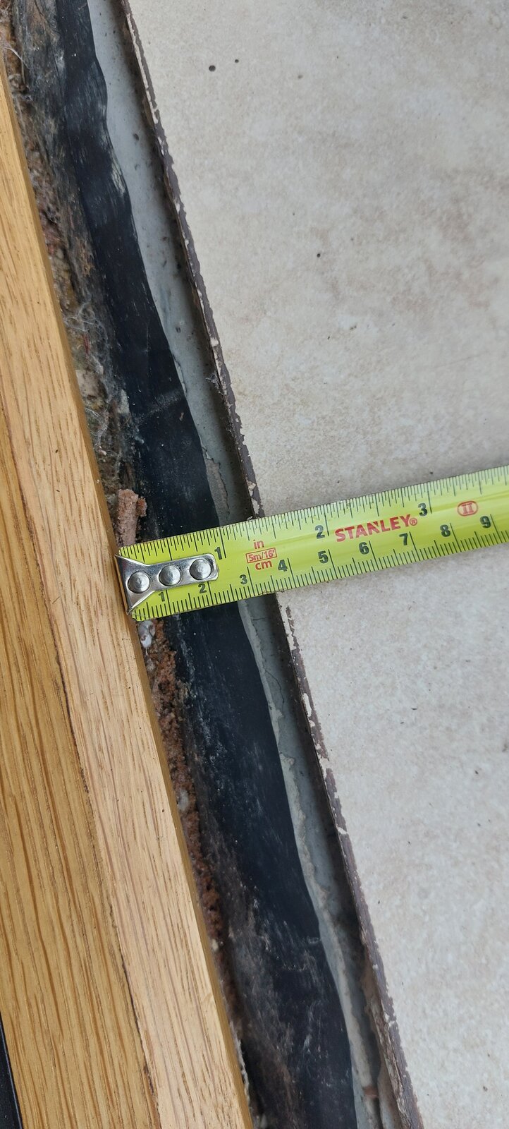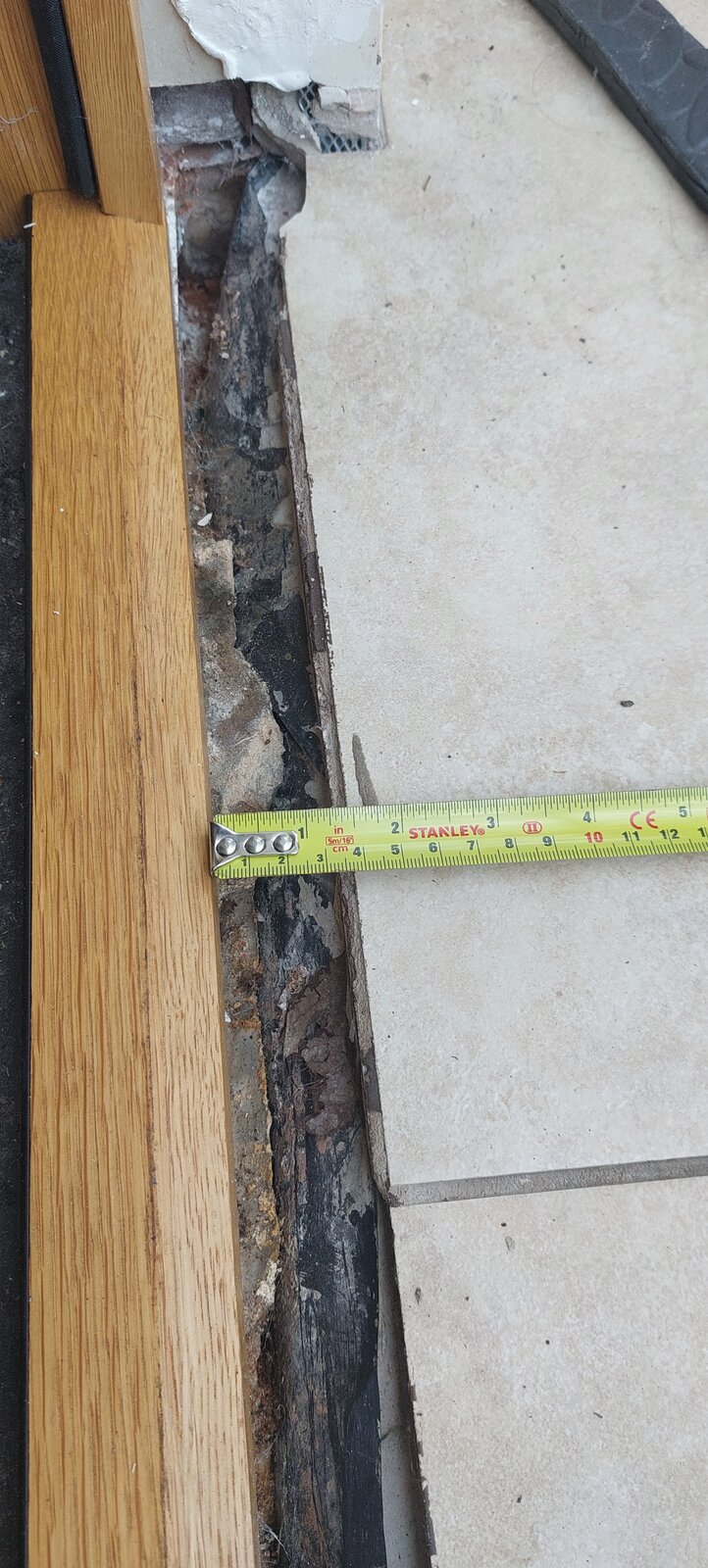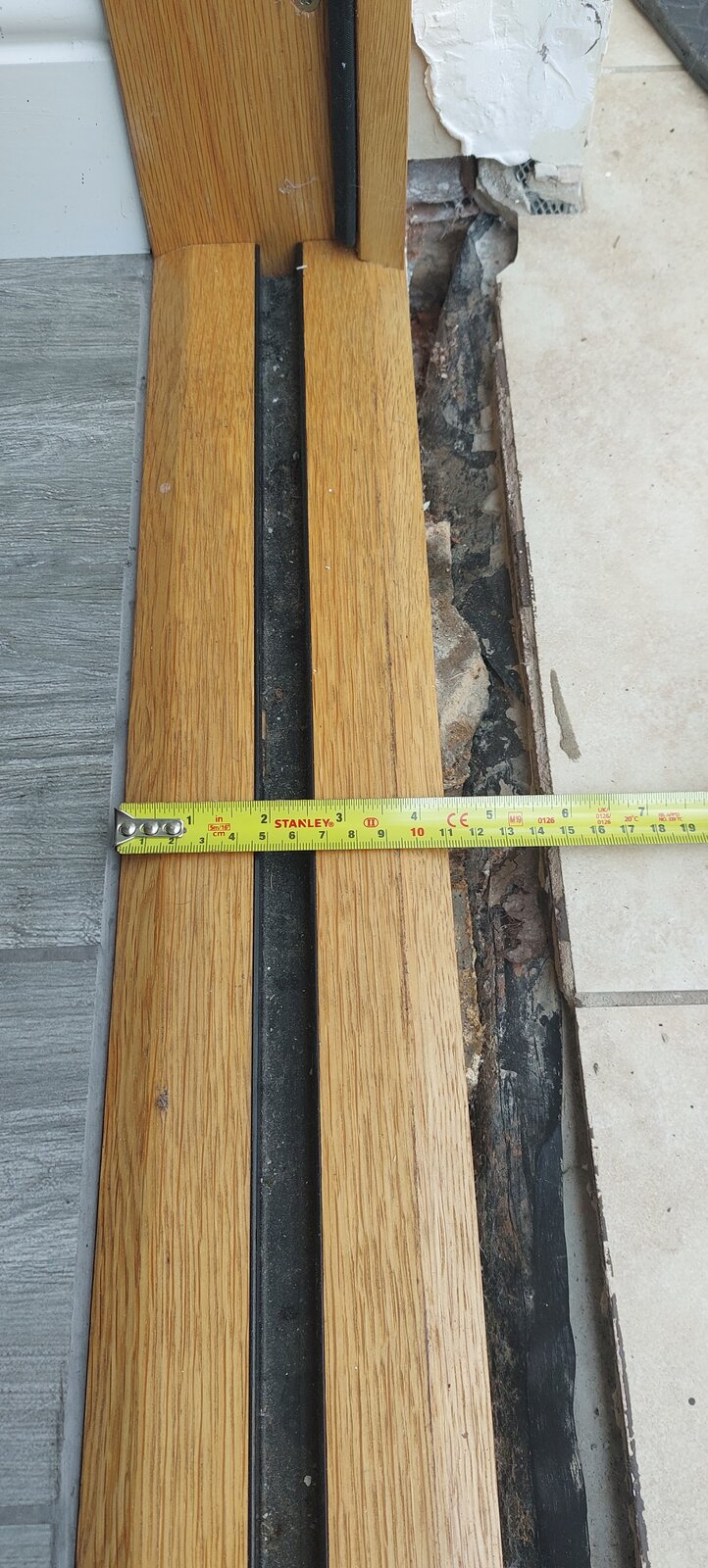 Slowly renovating our house and I've replaced an old patio door with oak french doors that lead from the kitchen into the conservatory and retiled the kitchen floor (grey tiles are new ones, buff colour old to be replaced). The conservatory was built a few years after the house, so the old patio doors would have been an exit to the garden. I now want to replace the tiles in the conservatory so they match the kitchen but I have this gap, about 2-3cm wide to bridge.