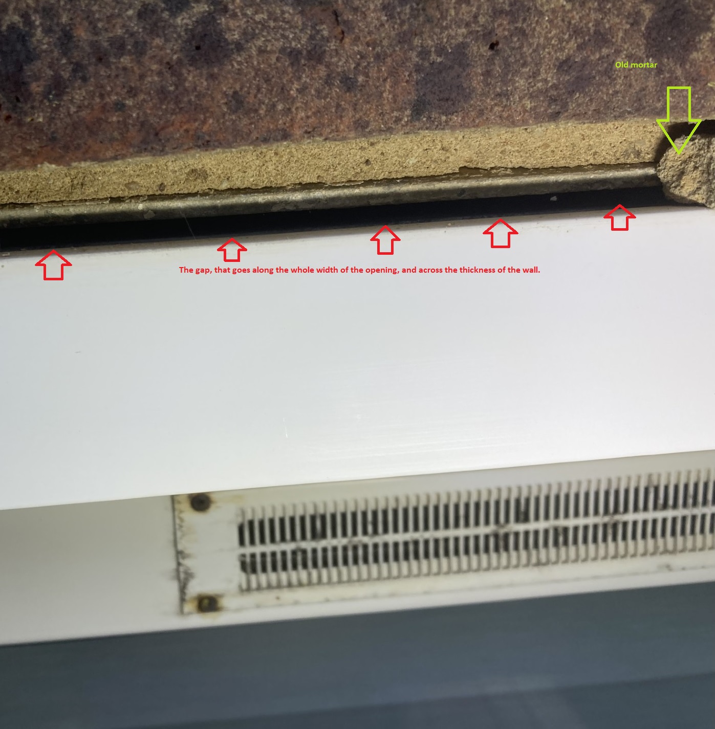 3. Silicone only the bit from frame to bottom of lintel and leave the existing mortar bed above the lintel exposed.