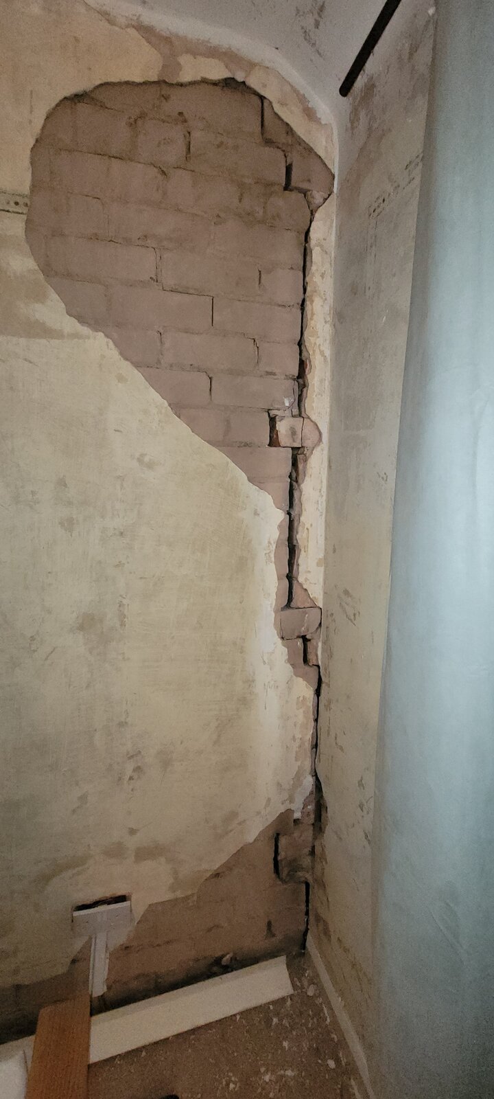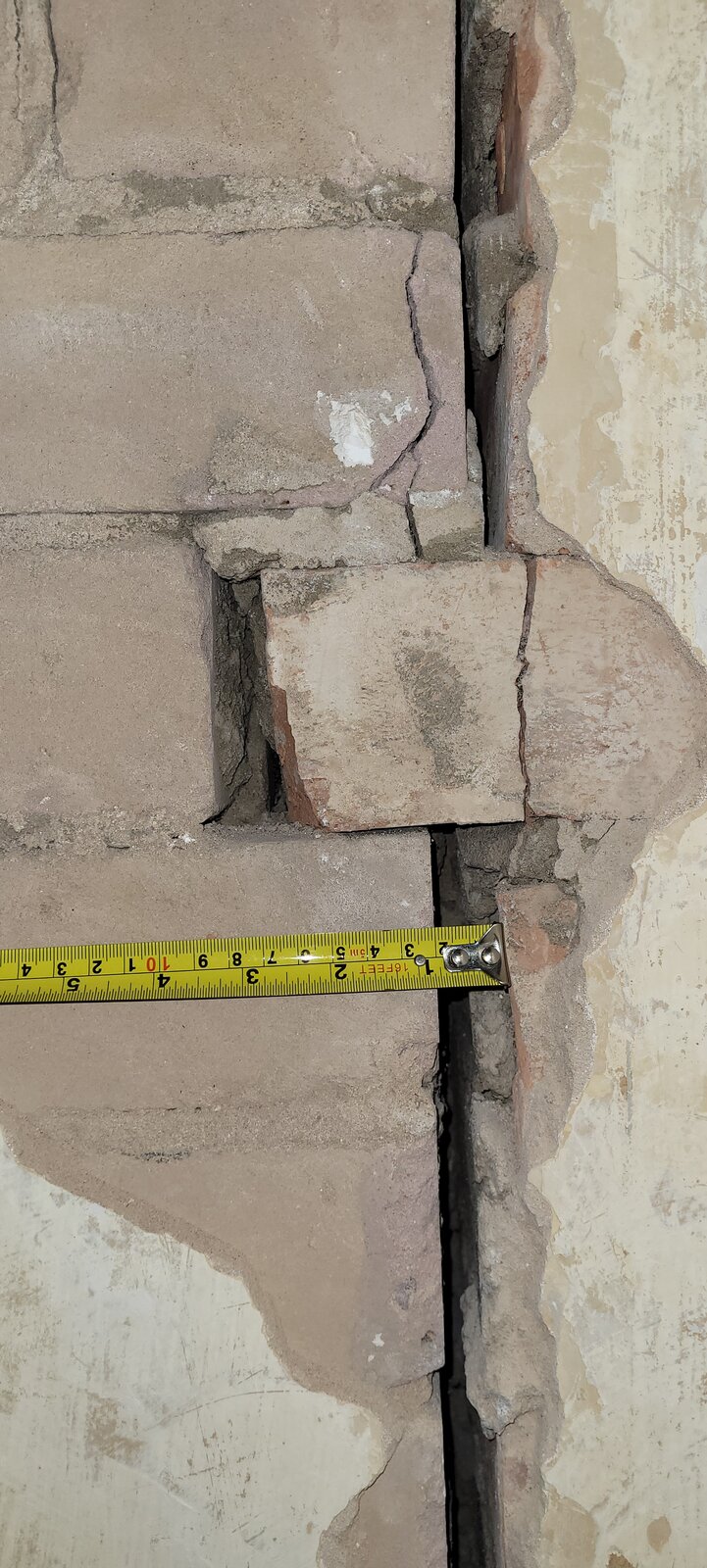 The gap in the brick varies, but is around 2cm at its widest (often where it looks like theres no mortar). Some of the bricks are also cracked, as seen in pics. There were some small cracks in the plaster above this gap, which was removed as it had loosened (some fell off when the wallpaper was removed). It also looks like some small areas were also previously patched with white filler.