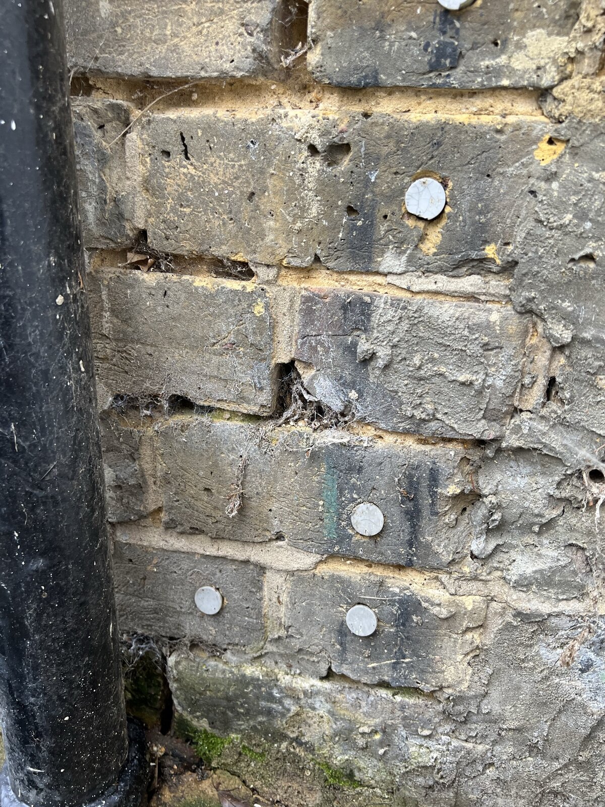 What's the best way to fill these gaps in the mortar? I'm particularly concerned about the large hole behind the drain pipe. When it rains it looks like water is getting into the wall.