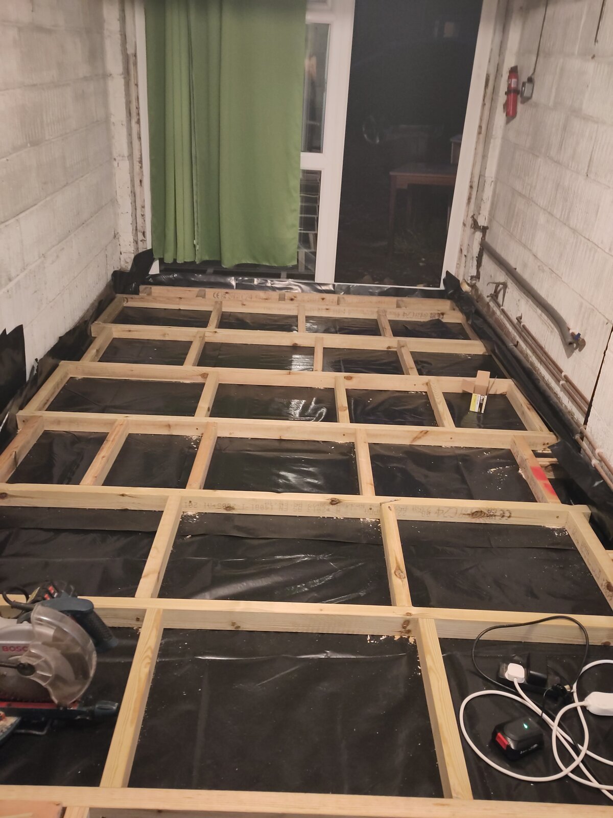 So far I've put dpm sheet down, and I've built a timber frame, which I'm going to put kingspan into each space, then chipboard.