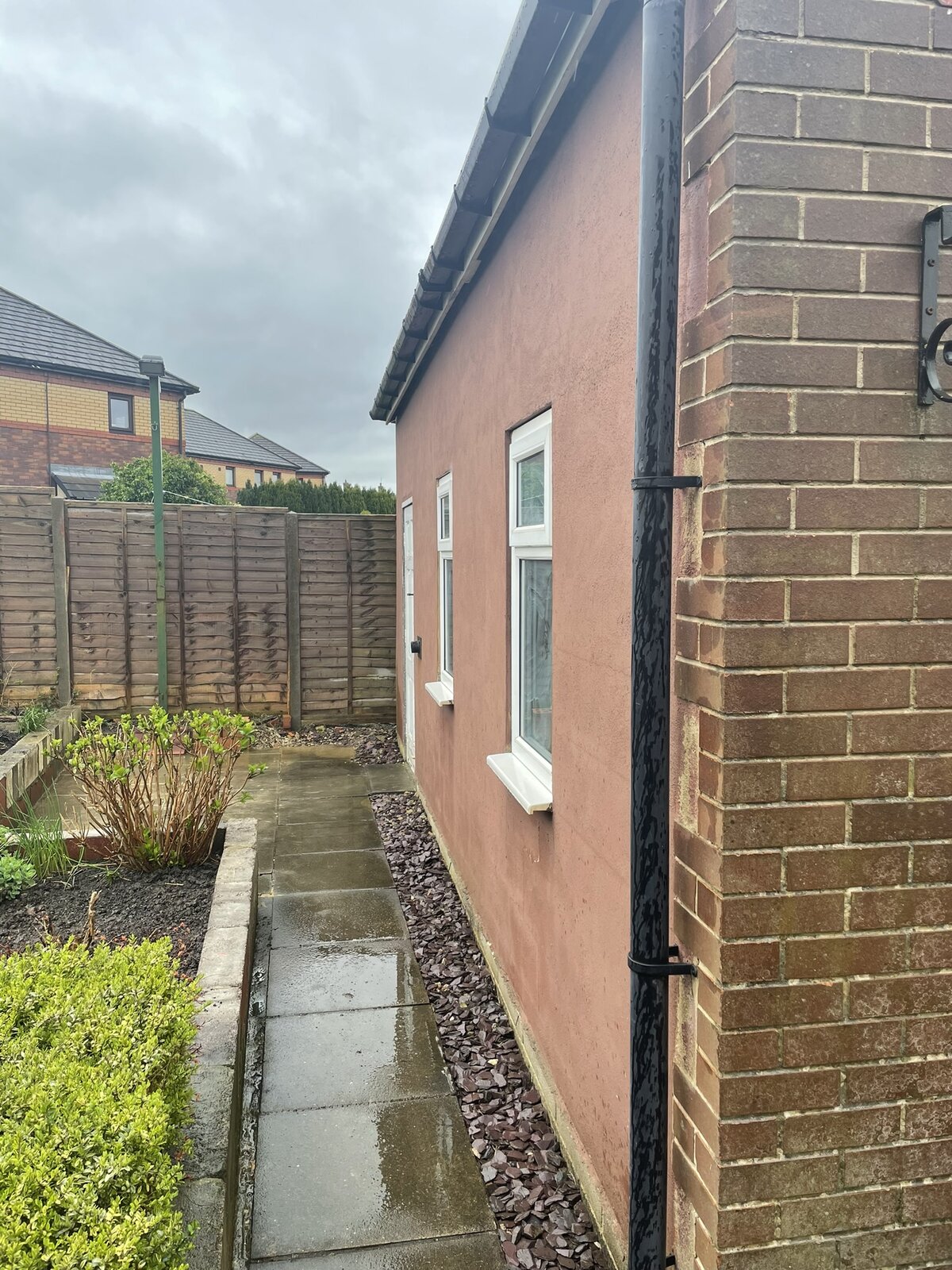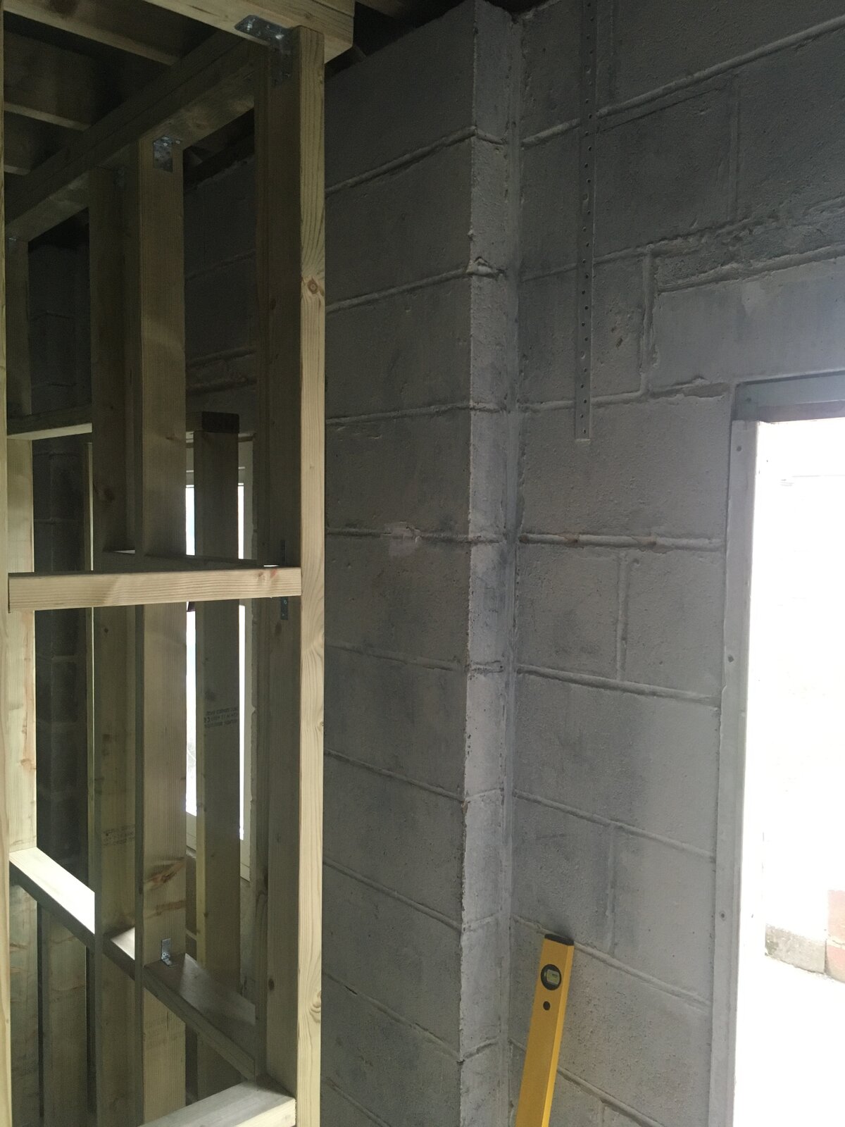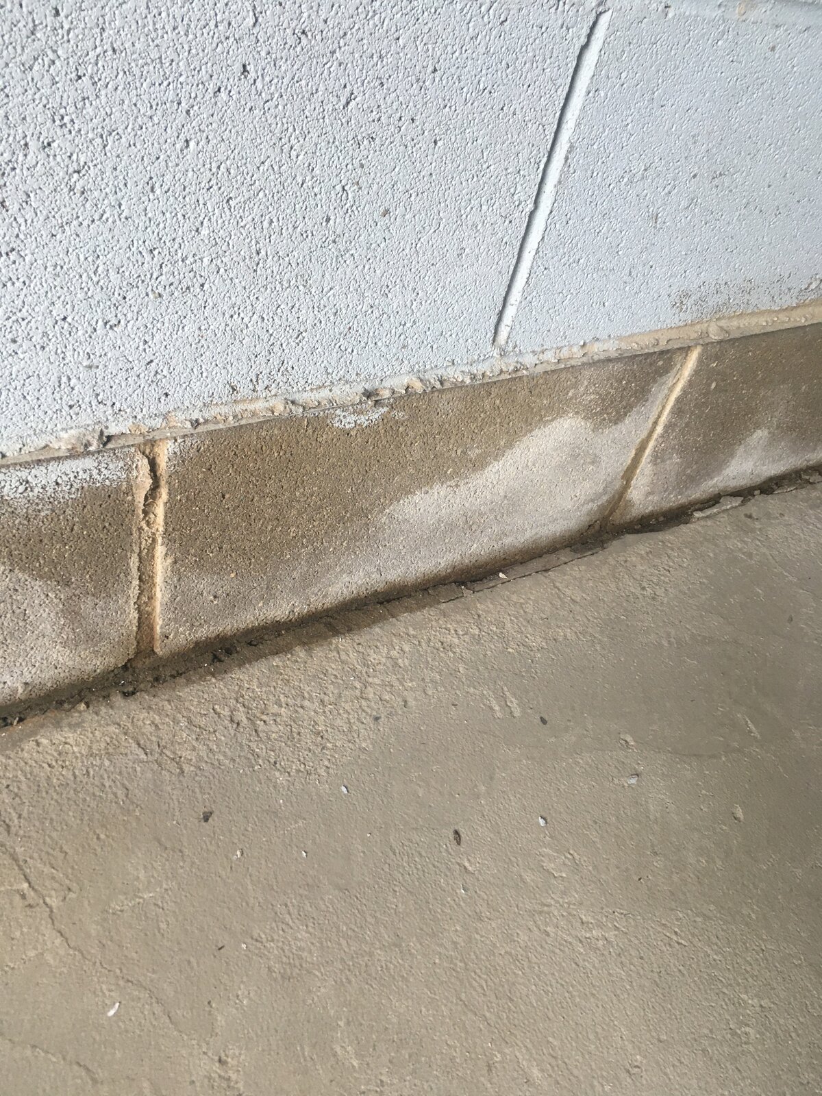 Single skin breeze block garage, rendered outside. Leaking tiny bit on the bottom between floor and wall. Double block column sometimes wet which creates white fluffy mold.
