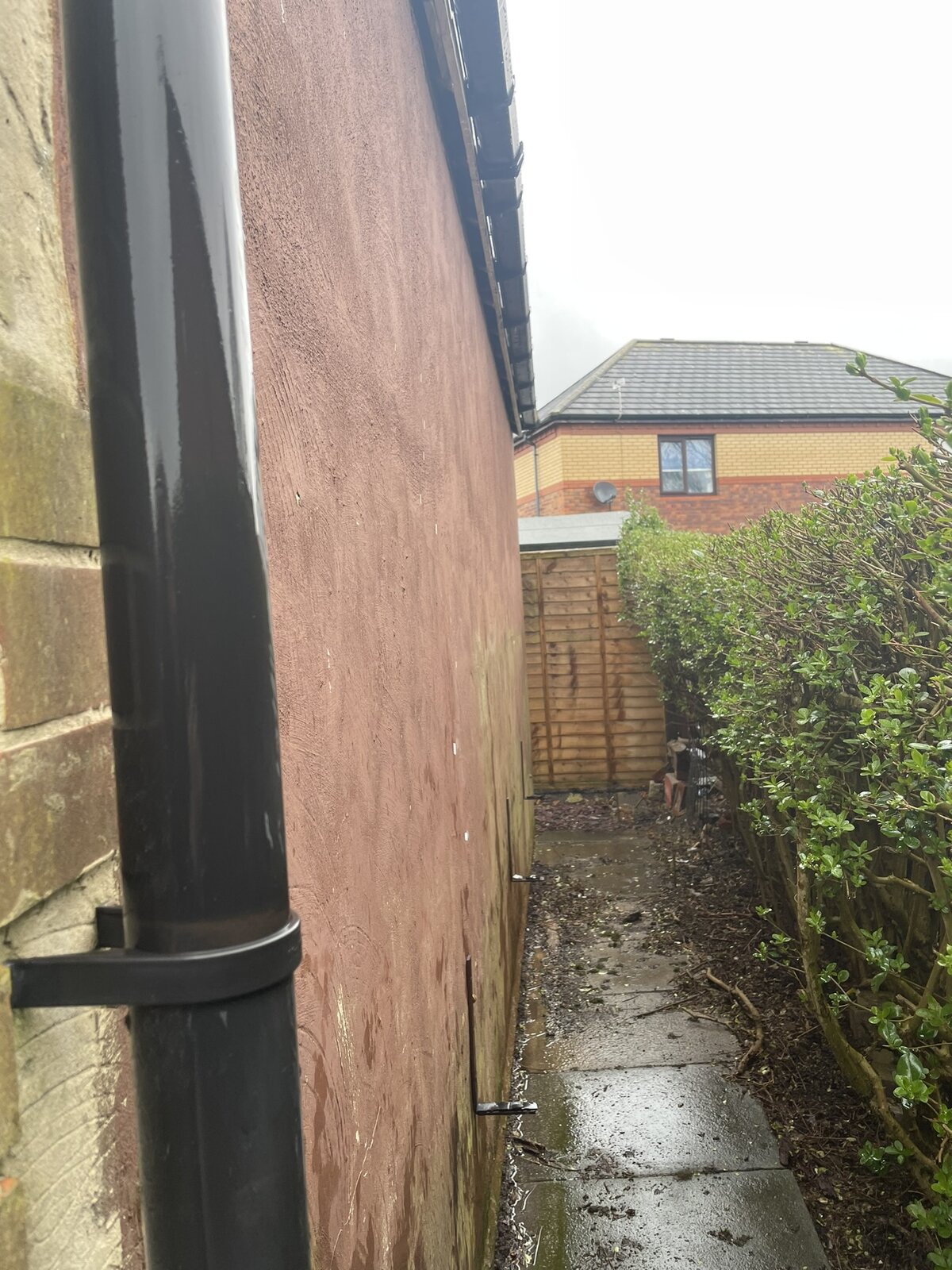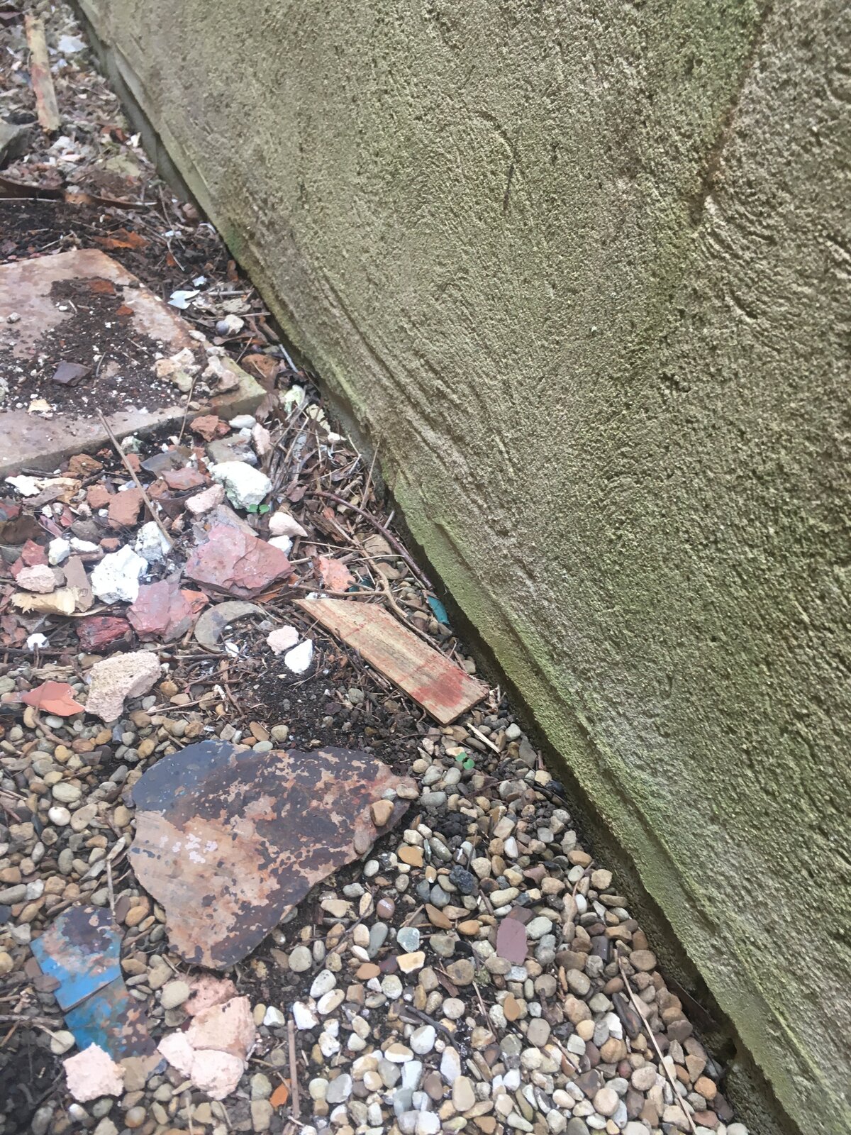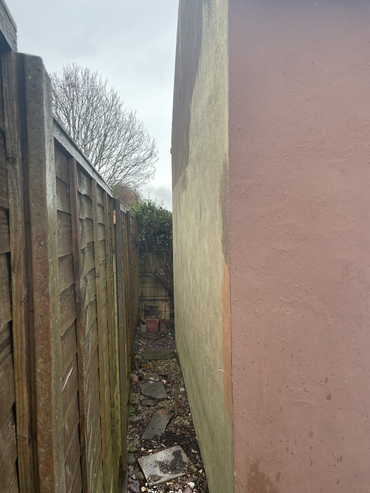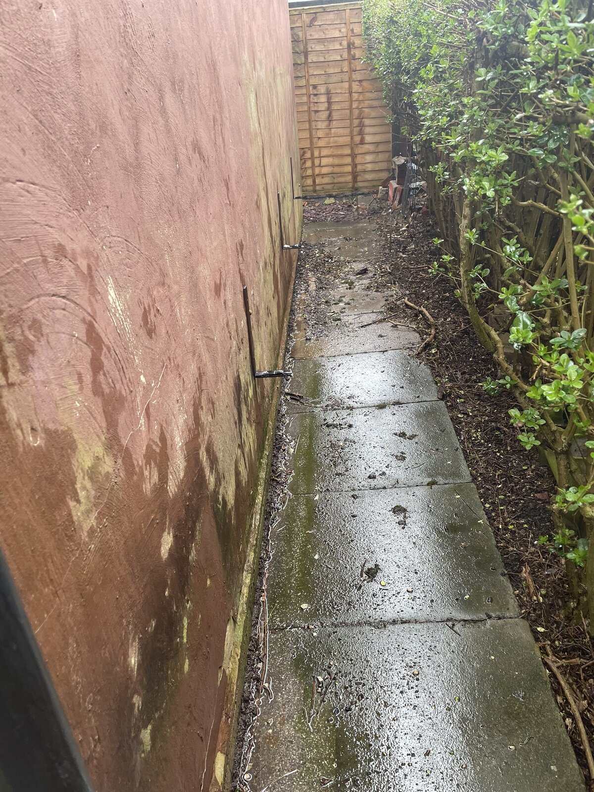 Single skin breeze block garage, rendered outside. Leaking tiny bit on the bottom between floor and wall. Double block column sometimes wet which creates white fluffy mold.