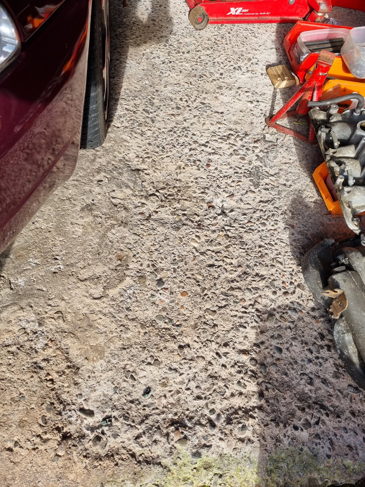 I'd quite like to fix it, and i've heard of self levelling compounds etc, but i've no idea if these are suitable for such an environment where you might be using axle stands and jacks etc.