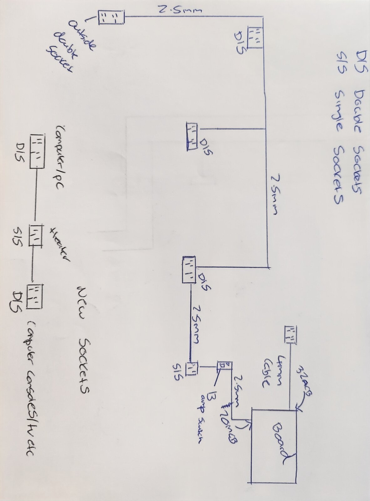 I'm looking to add some additional sockets in garage shown in black pen. Am i able to connects these to 32mcb socket using 4mm cable on a radial? Does the 2.5mm radial already there look OK?