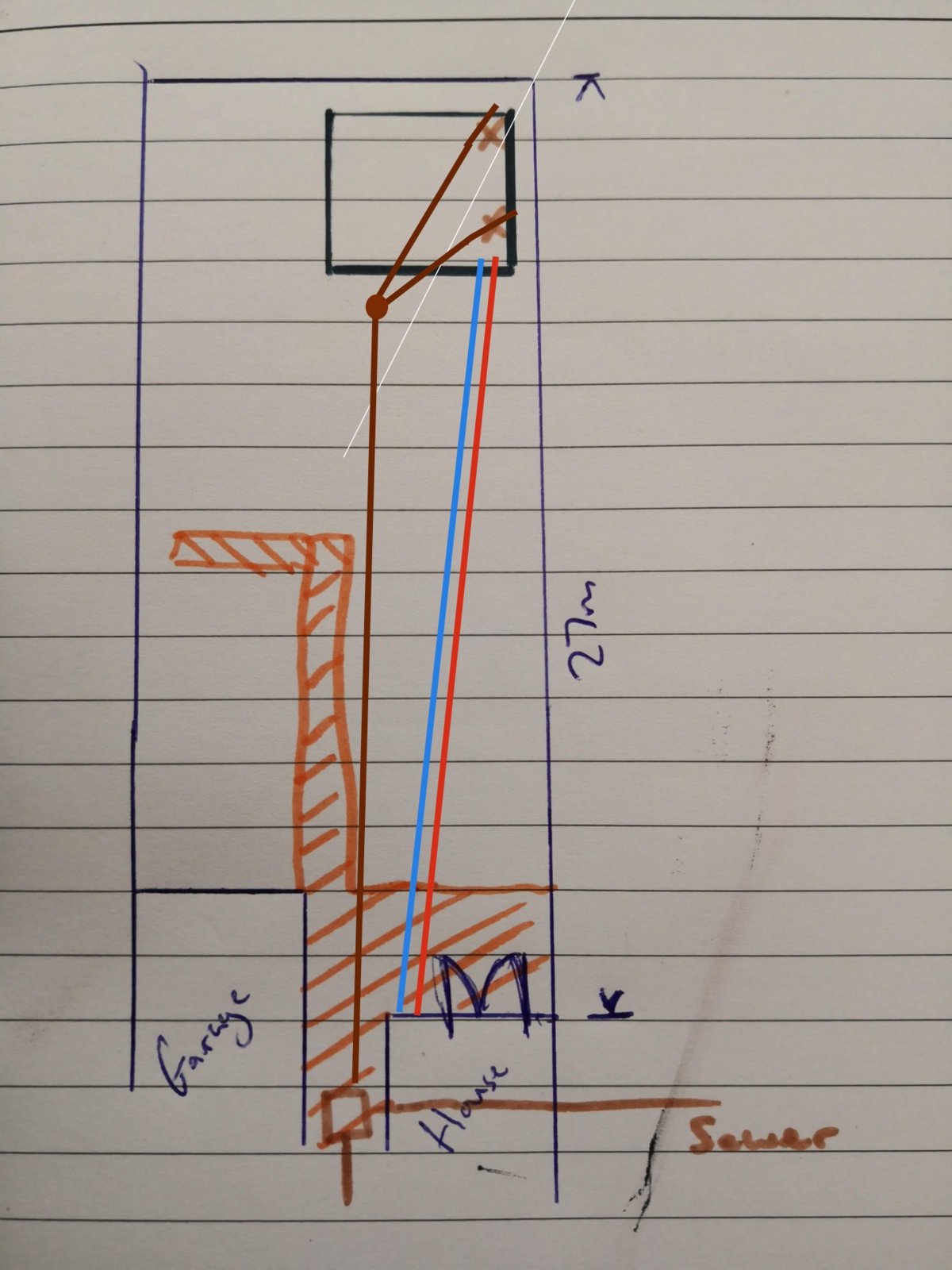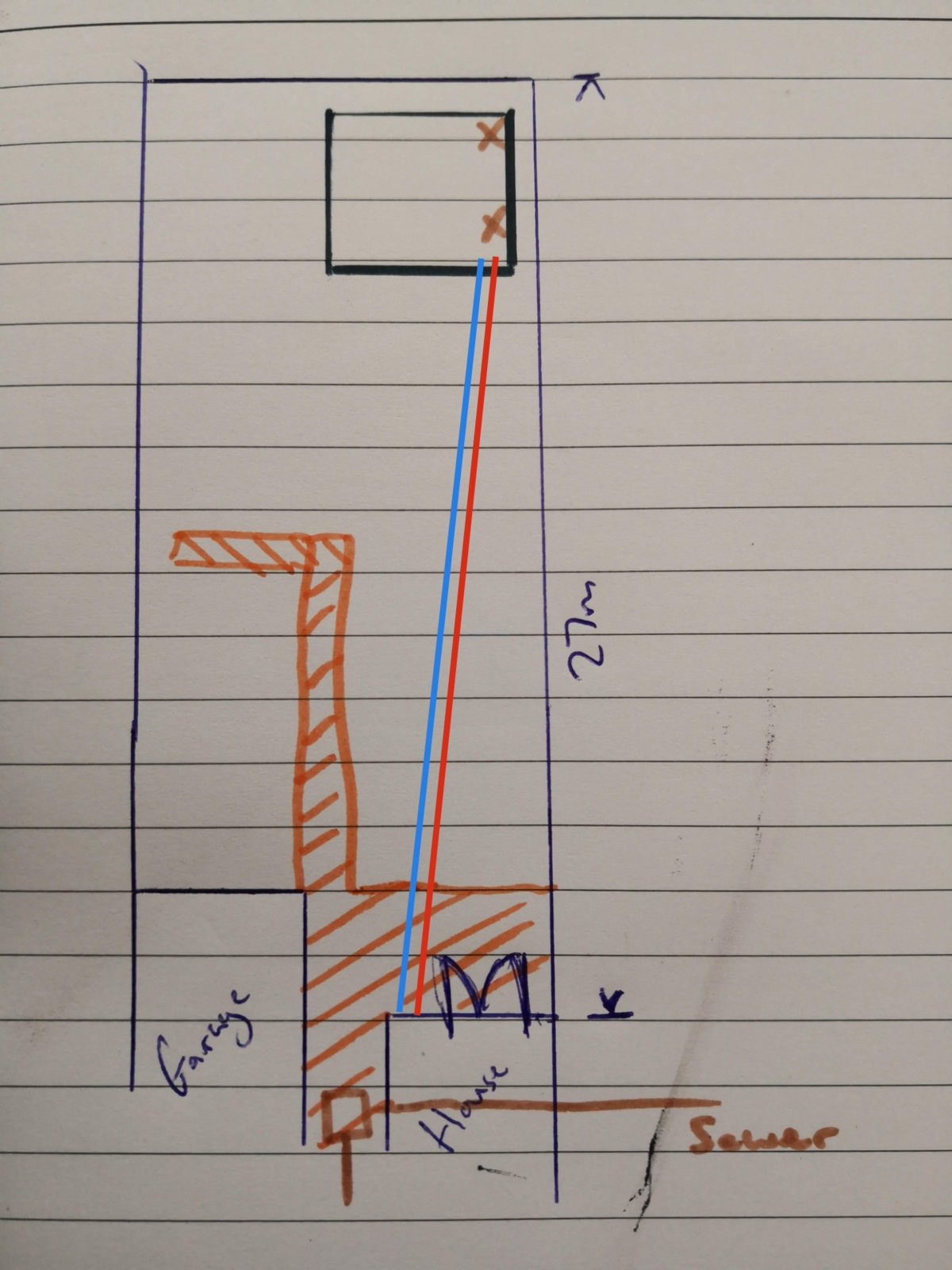 The 2 brown X's are where the toilet and kitchen sink will be placed, and the brown square is the nearest manhole cover. Blue and Red are where I'm intending to run Power + Comms and Water feeds. Orange hatching is concreted areas.
