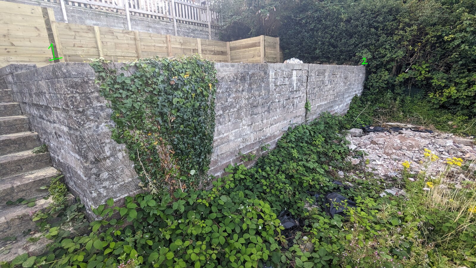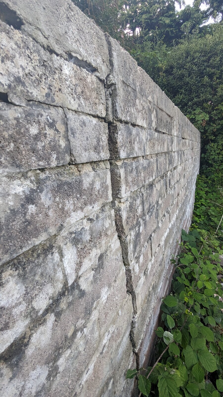 The wall is roughly 7.5m x 1.4m. Where it shows number 2 in the photo, the wall isn't joined onto anything that side so it appears to have less stability the further along it goes maybe.