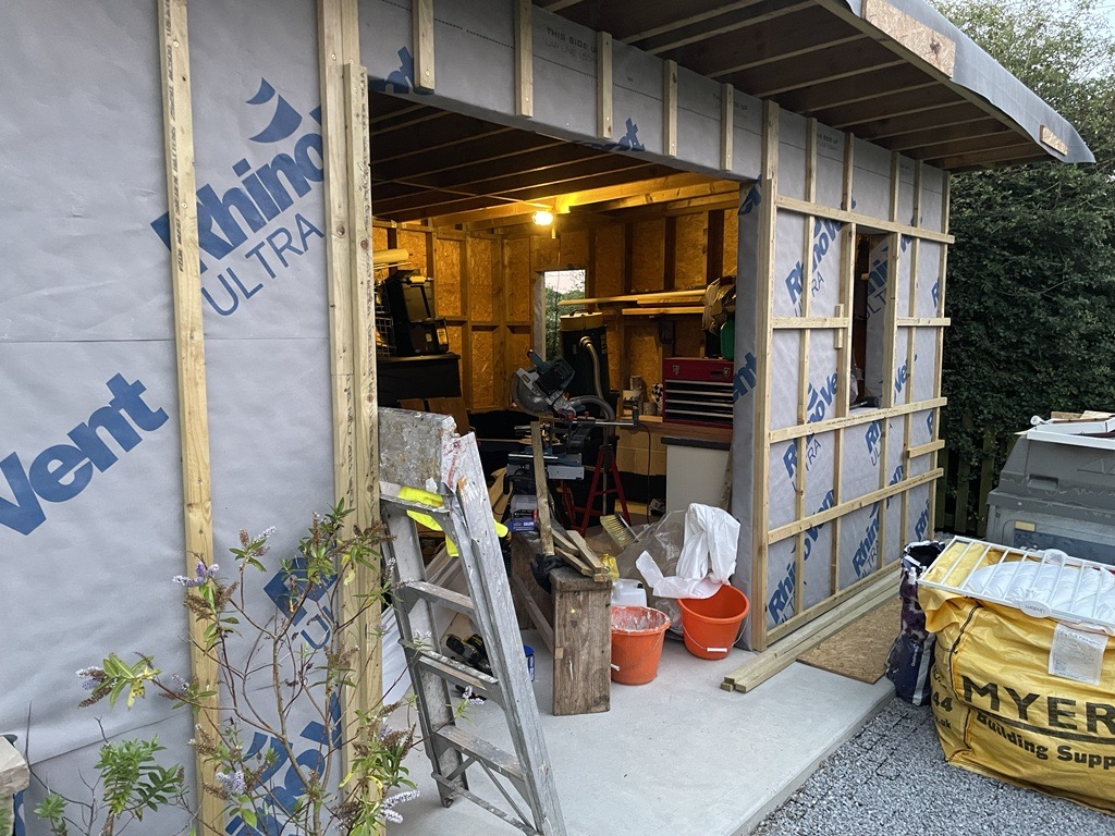 I took the decision to build on top of the block walls - standard 4 x 2 pressure treated + 11mm OSB framing as I couldn't see how I could build inside the perimeter / on the slab without water being a serious problem. This build is fairly advanced now, all framing, roof done but it has some problems