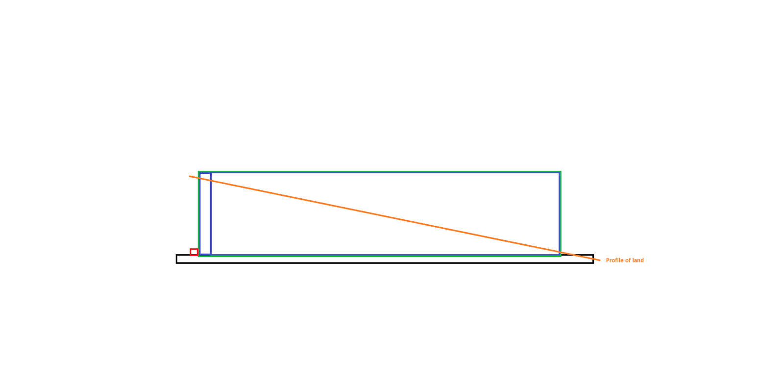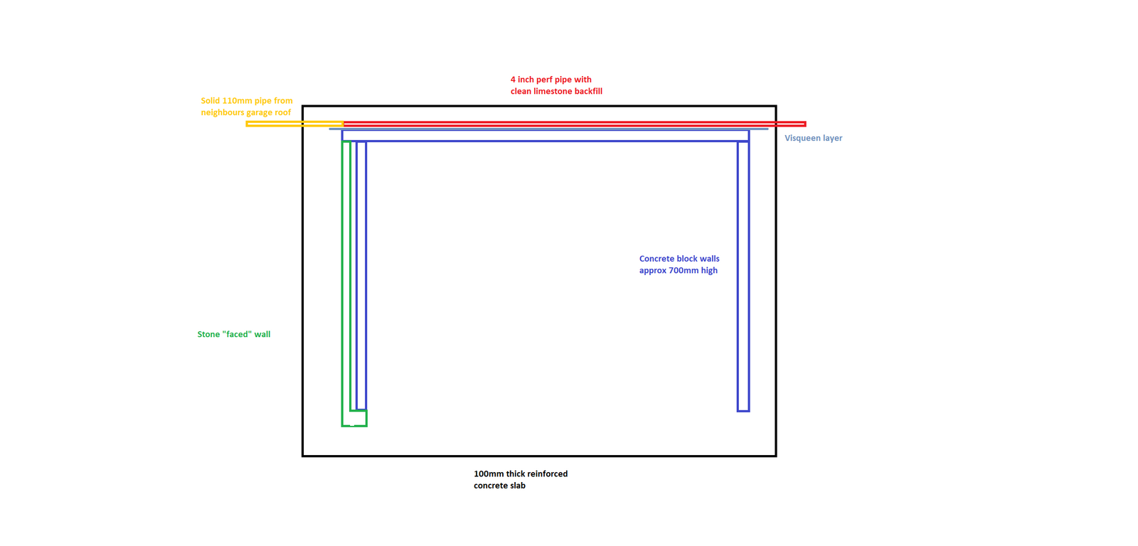 As there was a slope a retaining wall (approx 700mm high) was required on the rear and the path / slope side required a facing wall to match existing stone. Rather than form separate strip foundations the landscaper laid the slab and the walls were built on top (plans.png)