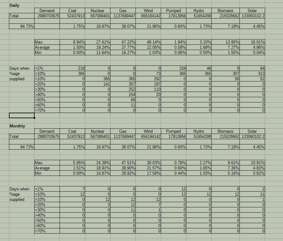 Looking through the figures, there are plenty of instances of wind supplying less than 10% for 3, 4, 5, 6 or more days on the trot. Compared to an average of 22%, you are talking about having available (from storage) a minimum of 100% of a days consumption (15% shortfall times 7 = 105%) which (if I have calculated this correctly) is c. 850 GWh. And that is available, no storage is close to 100% efficient so quite a bit more than 850GWh needs to be put in.