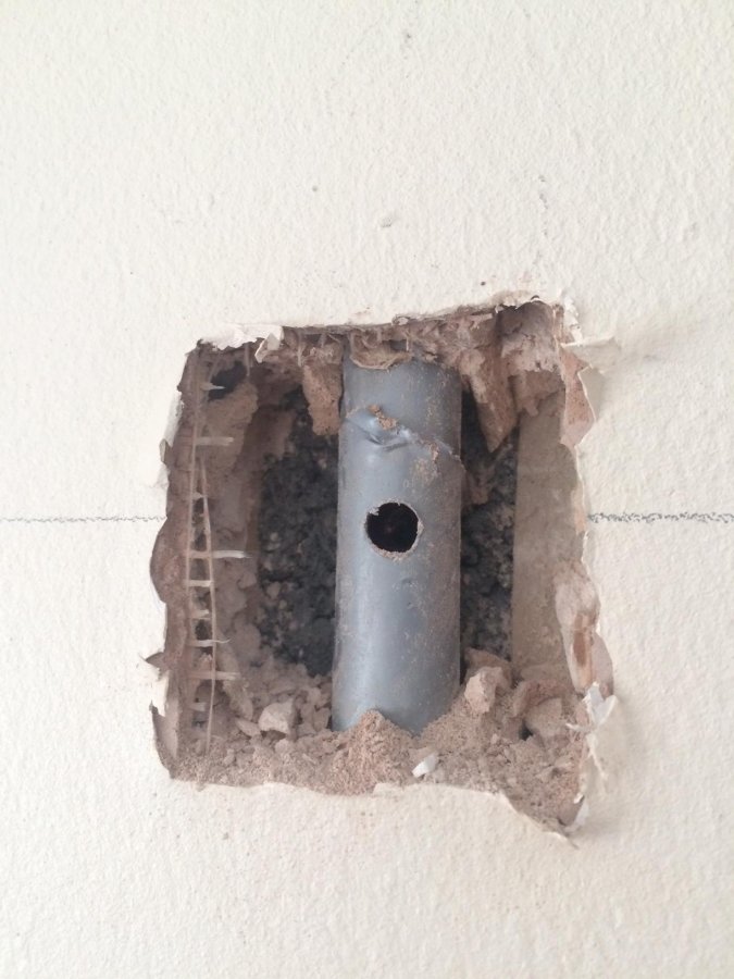 We were incredibly lucky I managed to hit the pipe so central; had I caught it just to the side it would have resulted in a small leak which could have eventually poisoned us or caused an explosion. It was my fault, but what a stupid place to put a gas pipe. It ran along the top of the wall and straight down to the fireplace above the mantlepiece which is generally the area where people screw and nail pictures/mirrors!