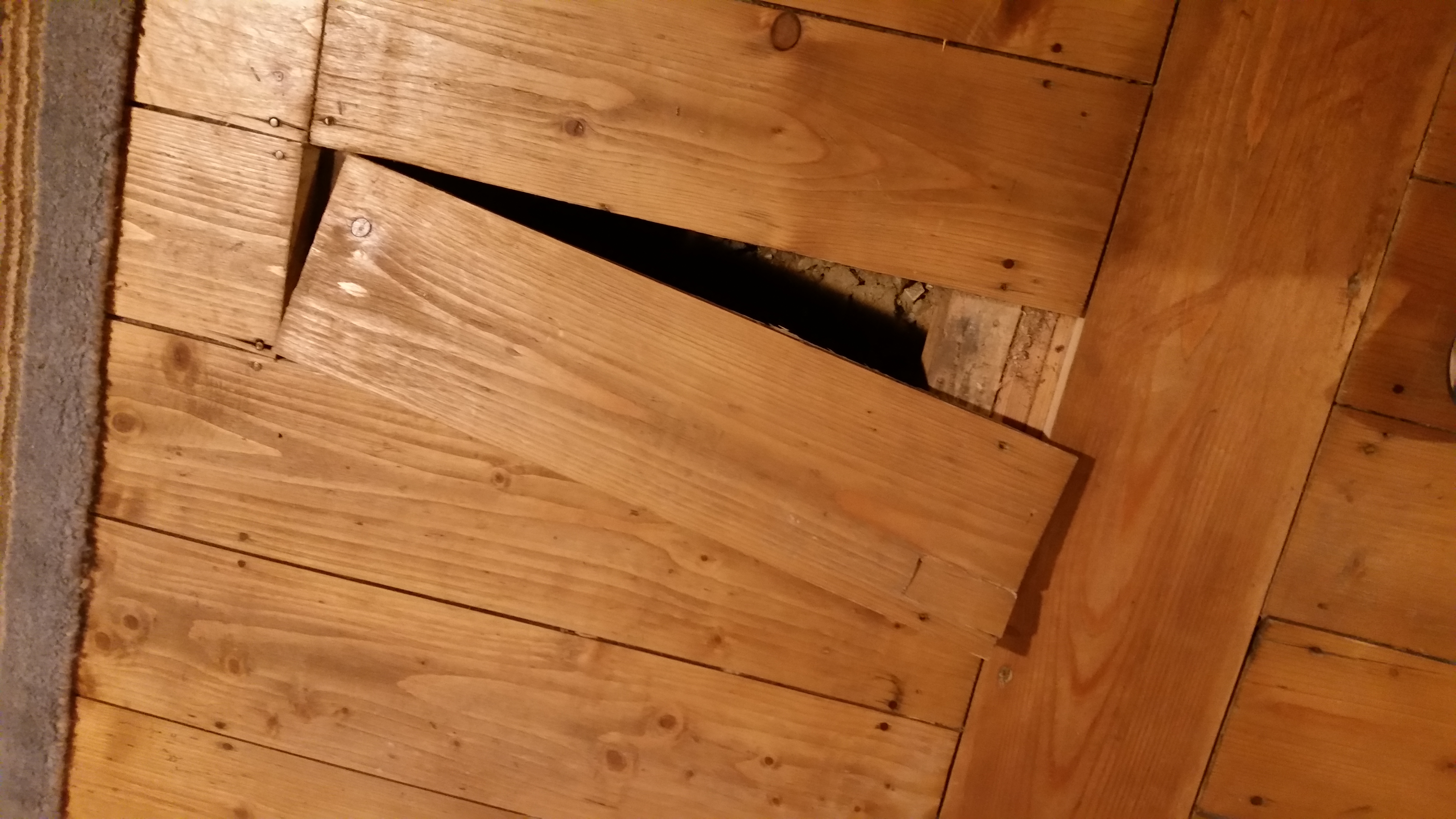Sand the scratched floorboard in the direction of the grain, but the other picture was too blured to asses. Do you have a cleat nail, or would a screw be acceptable, but do you know if there are any pipes under that floorboard that a nail or such may go through if yo have to mover the position of the nail.