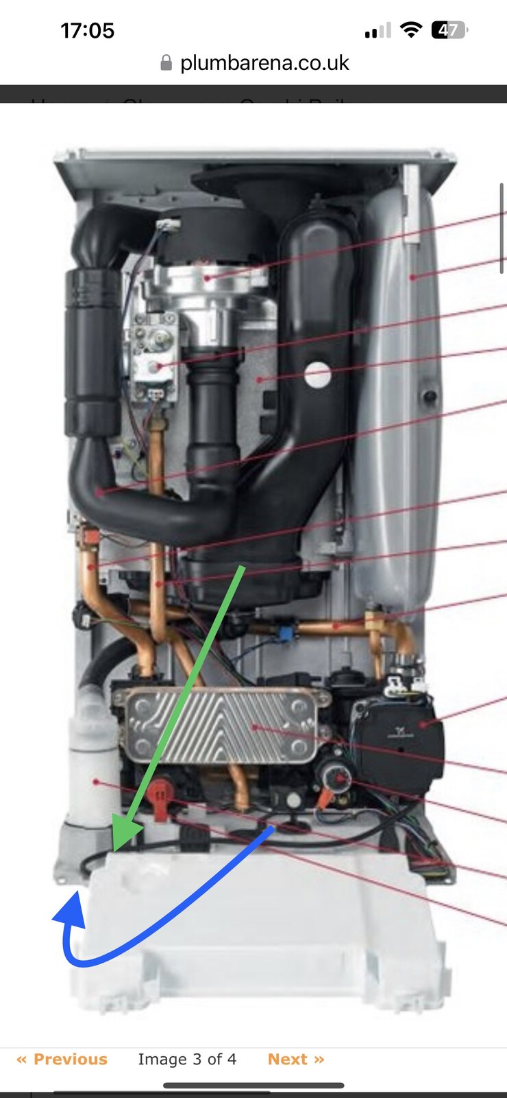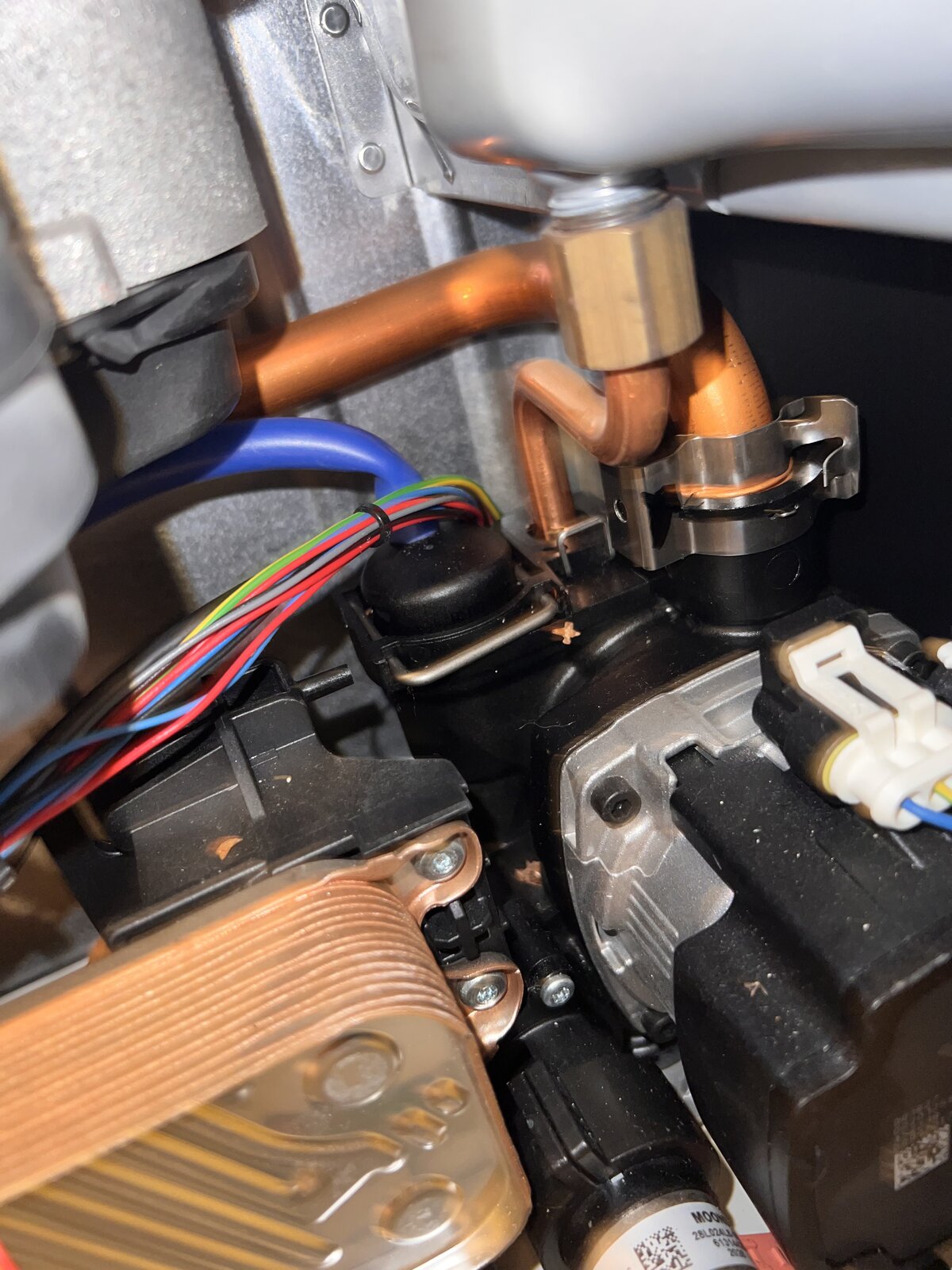 Last night i bled my radiators which had a fair bit of air in, upstairs mainly. Today my boiler had 0.0 pressure. I top the pressure back up to about 0.7 to only have a leak underneath the boiler. The leak is from the bottom left from a grey nipple right next to where the condenser pipe is attached but not part of it. The leak is 2-3 drips per minute and does not leak when the boiler is switched off. Any ideas what the issue might be ? Strange as all was fine till I bleed the rads and filled the boiler back up. The leak isn’t on the inside, just used the arrows to show where it is. Hope that helps