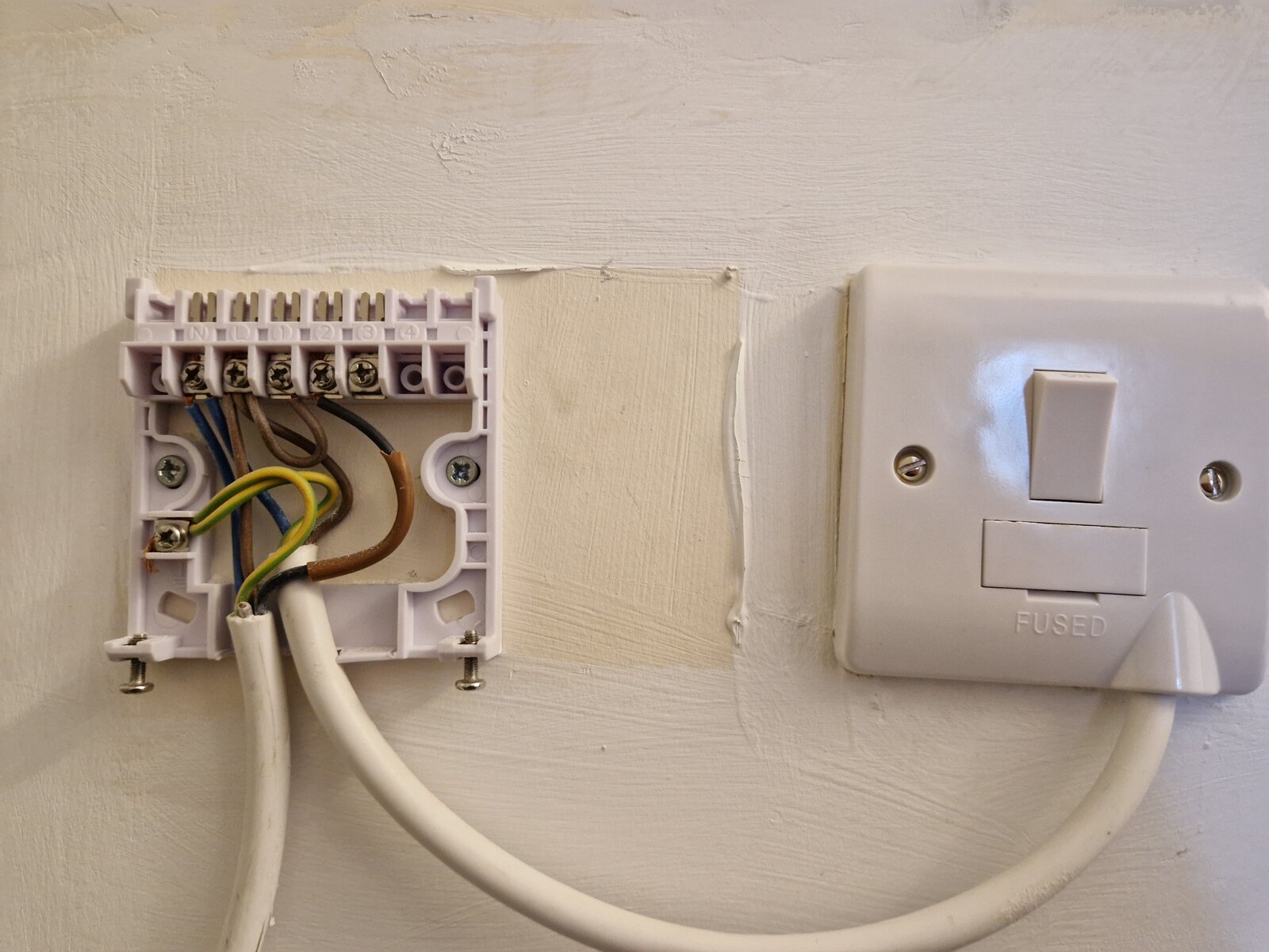 Having looked at the way in which it's set up currently it's as attached. The two cables coming into this are the mains input (right) and the boiler (left).