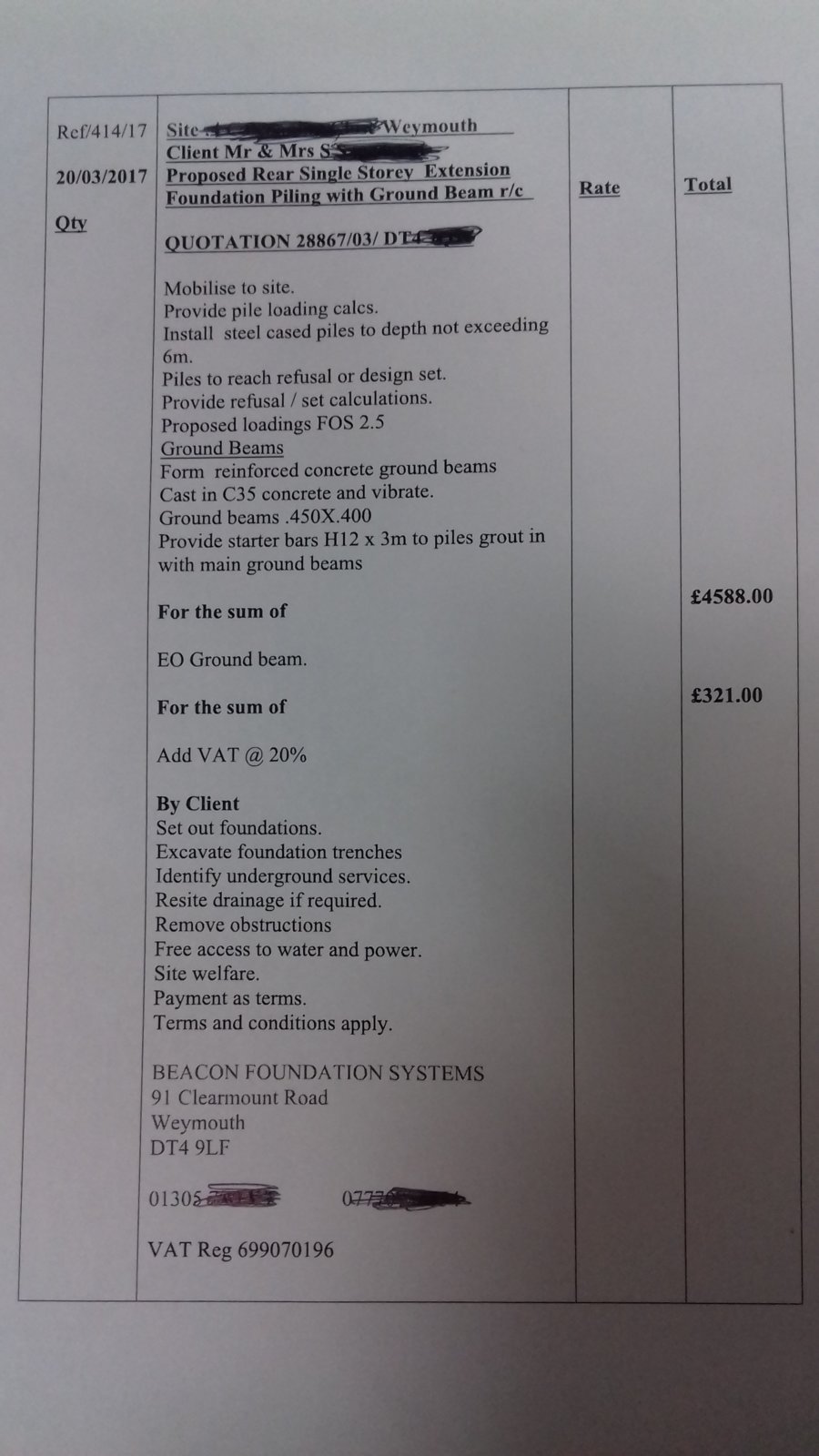 Had the council around before Christmas saying because our neighbour has trees close to our boundary we needed piling for our replacement extension. So we got a company to do a soil report and had drawings done to show the piling positions etc. Like most people, I had a budget for our small extension which has been blown to pieces due to the cost of the Steel Cased Piles (9k) and the ground beams. with the latter being 3k more than the piling. Although I’d rather have specialists in to do the piling, how difficult would undertaking the ground beams for an average DIYer? I ask this because I don’t have another 12k in my budget to have those done and I’m guessing the groundbeams are expensive because it’s a labour intensive job, rather than being a specialist job.