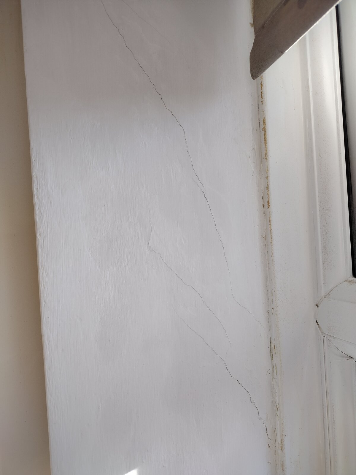 Small hairline cracks that show up as shadows when the sun is shining. Beside the kitchen window.