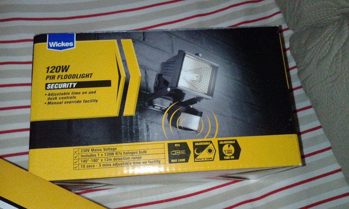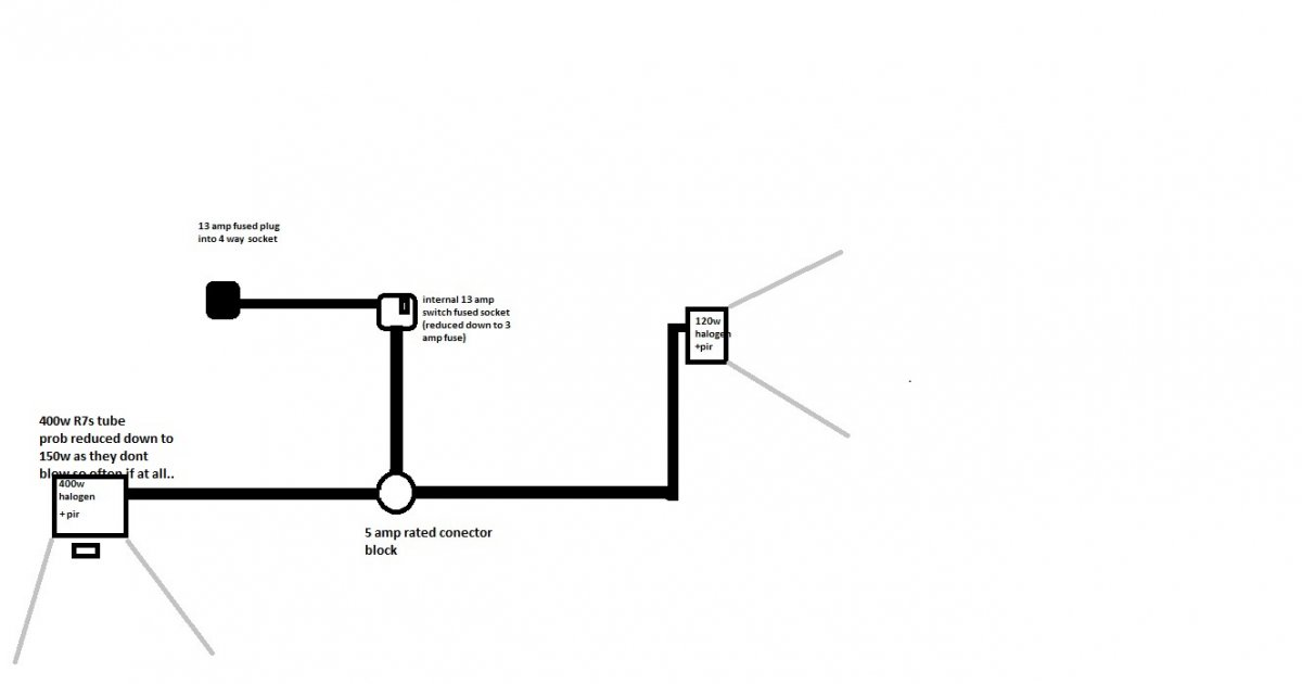 hi peeps, i currently have a 150 w floodlight on the wall with a pir but this is not working so good now. I am going to replace it with a new one and add a smaller 120w floodlight around the corner but wire two lights up into one power lead...i have asked a sparky mate if this is ok and he said yes with a few changes...so iv done a diagram first and thought id get you guys to see if its ok? thanks.