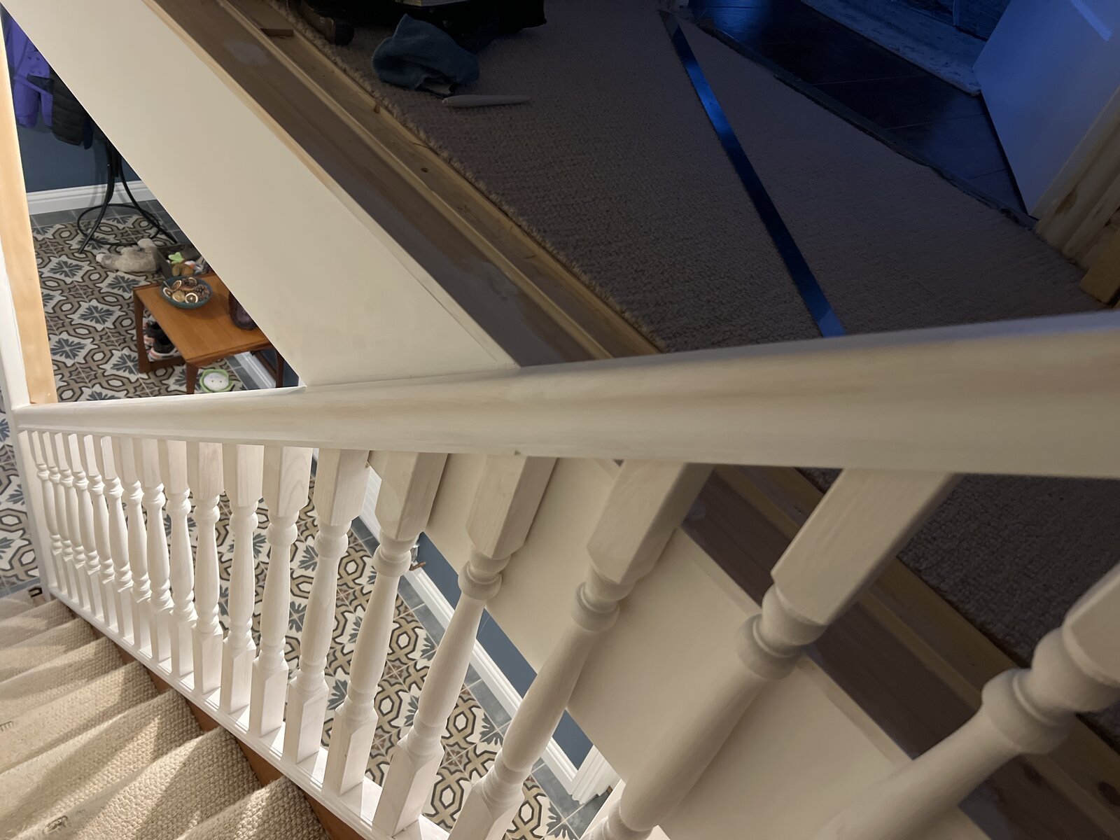 How do you think any wooden piece (included staircases) are fixed to the wall?I still can’t understand how a plug of sorts would work. As if screwing like that, won’t the handrail just be relying on the screw head to stabilise it? The thread won’t touch the wood, and will barely touch the plug. I’m not sure about that one. I don’t think the rail will come out any more than it is now anyways as it’s now in line with the posts at top and bottom - so a bigger trim shouldn’t be needed further down the line. Before, it was slightly blended inwards toward the ‘wall’ where it had been caulked.
