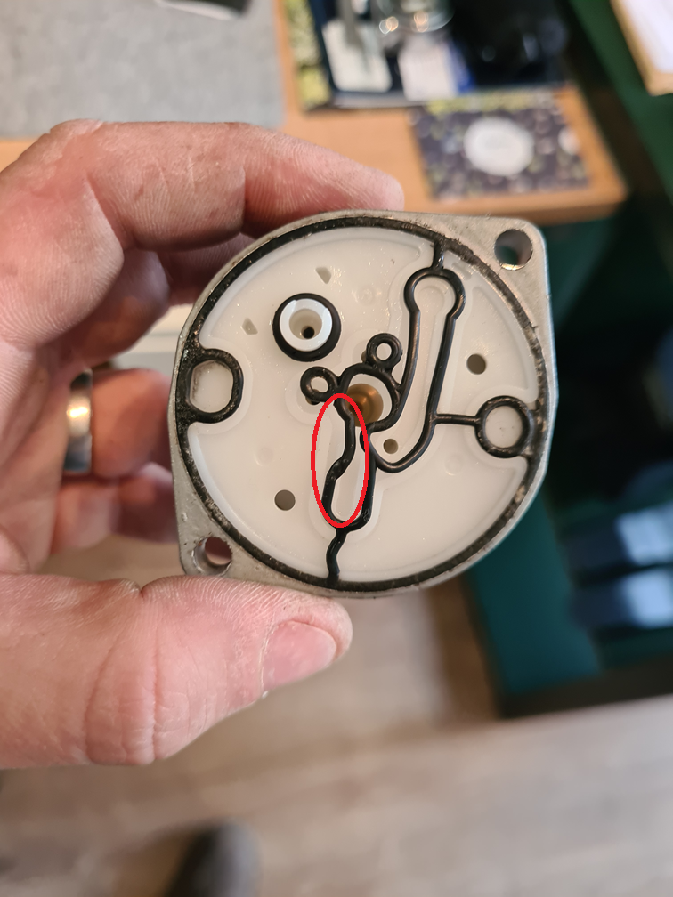 I noticed that the gasket is very tired which I suspect is cause for the leak and I am wondering if the routing of the gasket is preventing fuel from entering the main jet (see image and red circle).