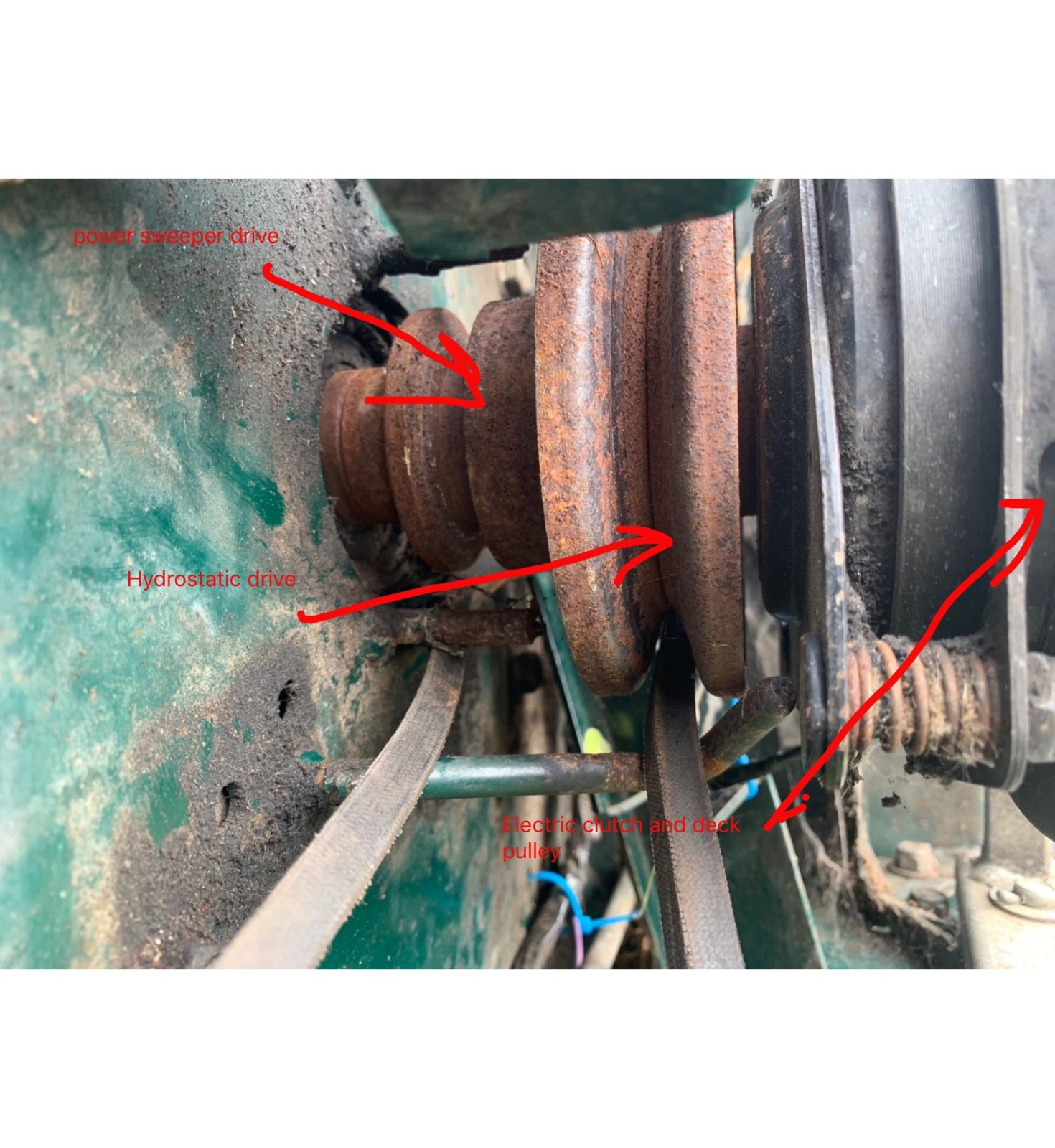 Yes, that’s better. First shows pulley that I’d expect to run/drive mower. Belt runs to back of mower (as shown in second of those pics). Lower pulley is connected to cutting deck and I assume powers that. The lever to the right of the seat is the hydro control or, at least, this was what I used to drive the mower forwards (and to reverse).