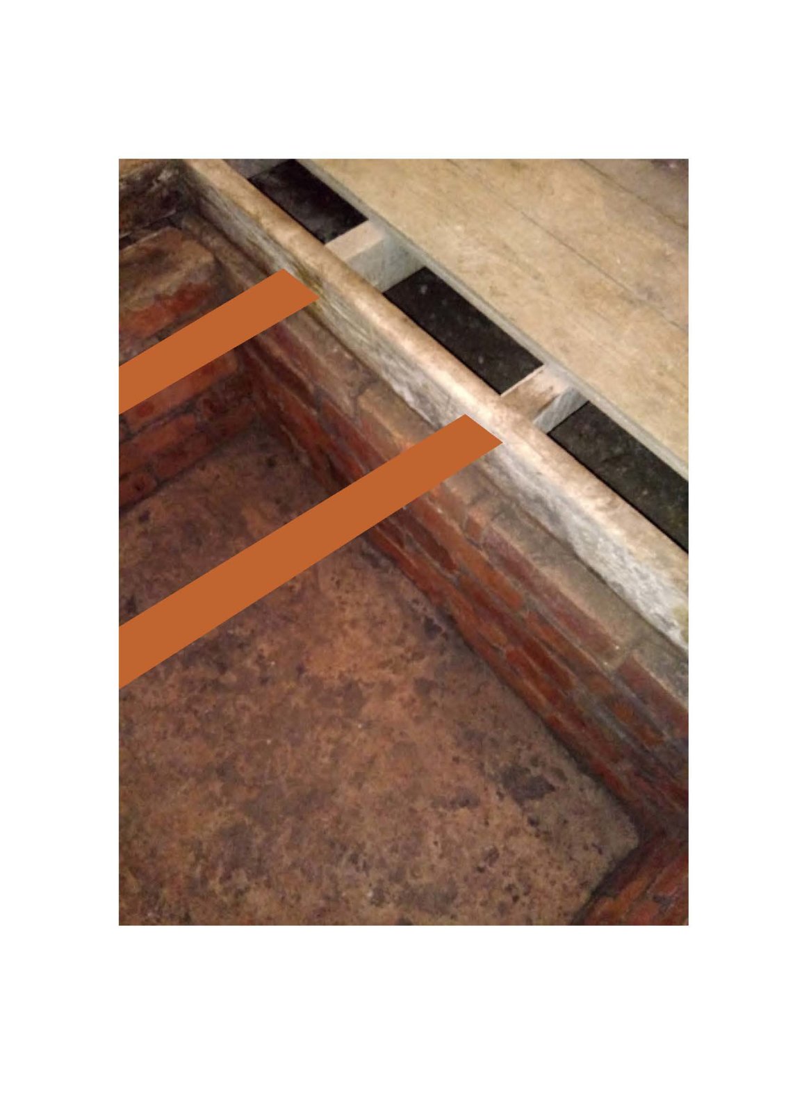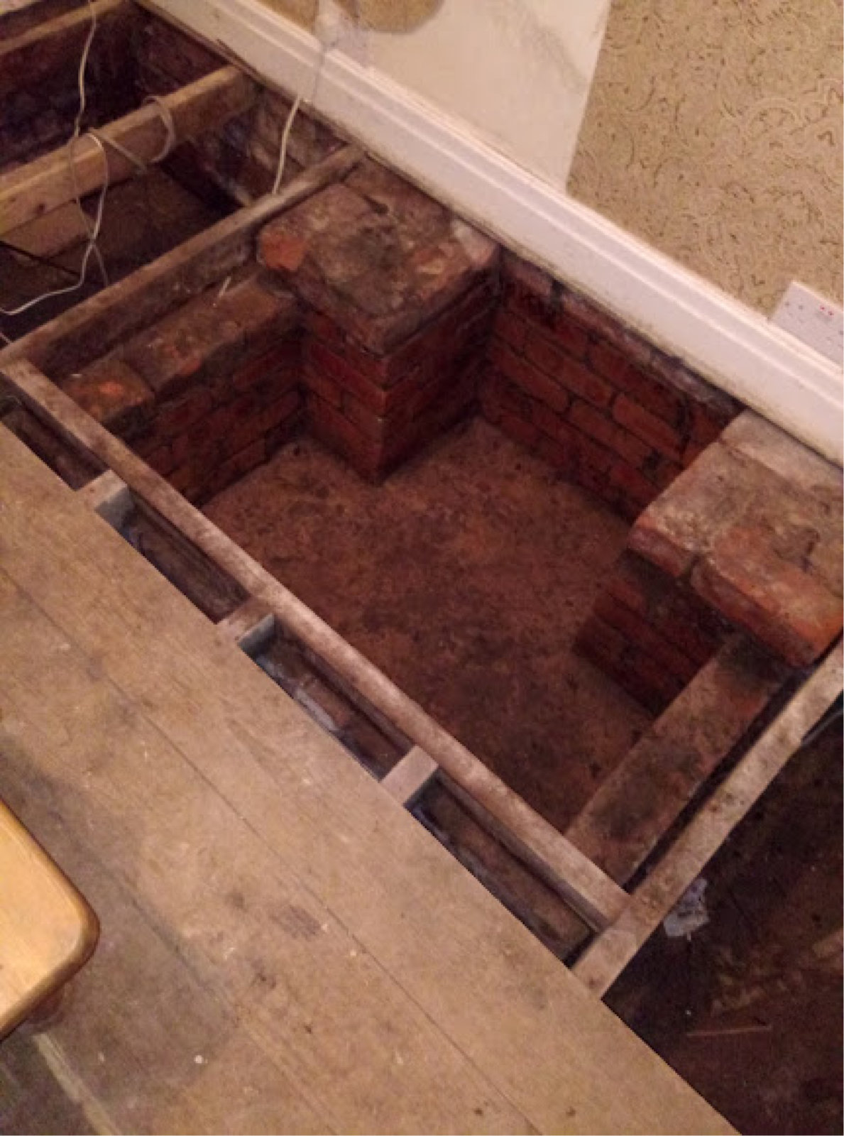 2. Add three short joists from the front wall of the hearth to the gable end of the house. All three short joists will sit on the front wall of the hearth. The other end of two of these joists will sit on the side columns of the hearth. The final joist will sit on a new sleeper wall built on the oversite.