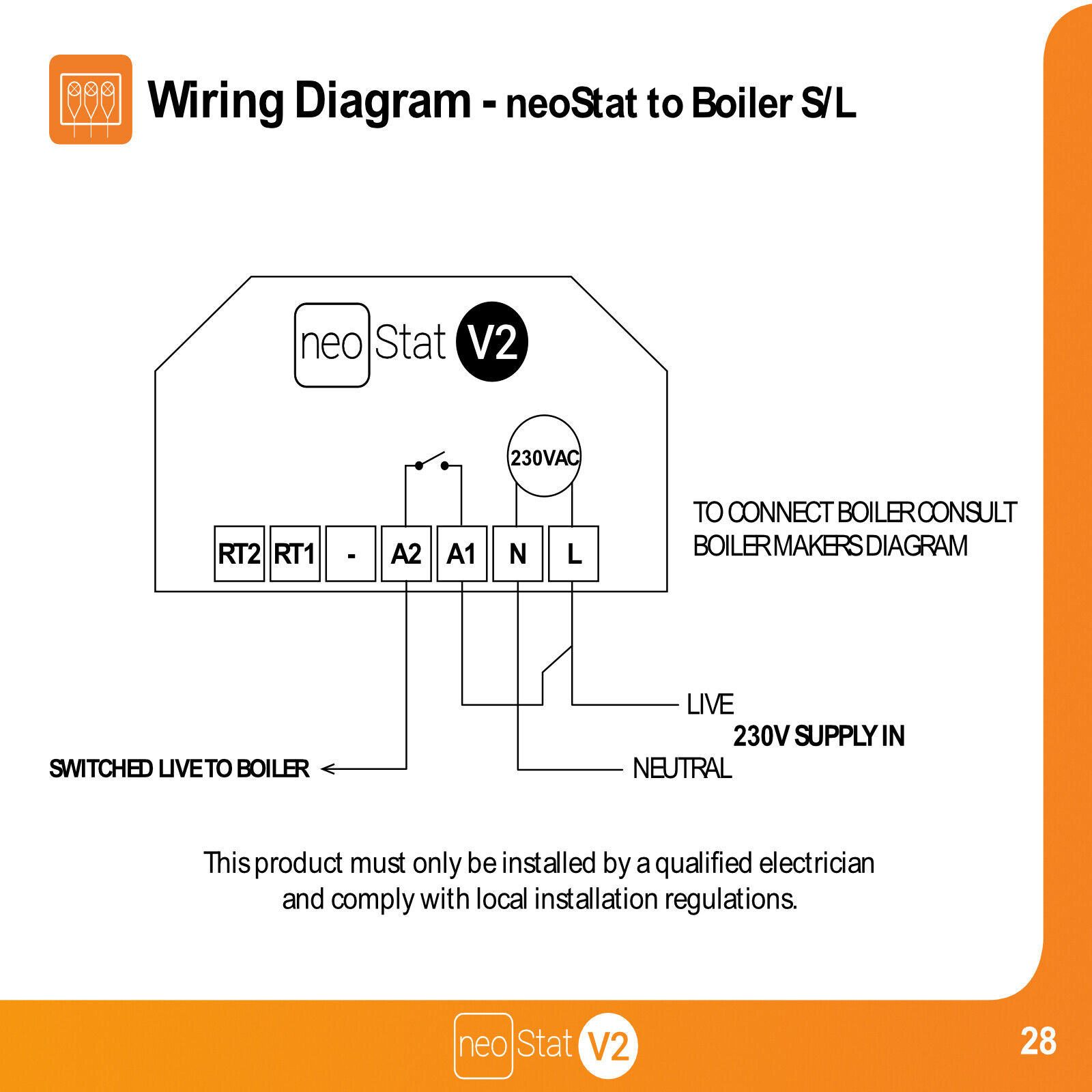 My Heatmiser Slimline was recently replaced by a Heatmiser Neostat Wifi. The wiring was kept the same, i.e. permanent live to L, permanent neutral to N, the live linked to A1 and the boiler to A2.