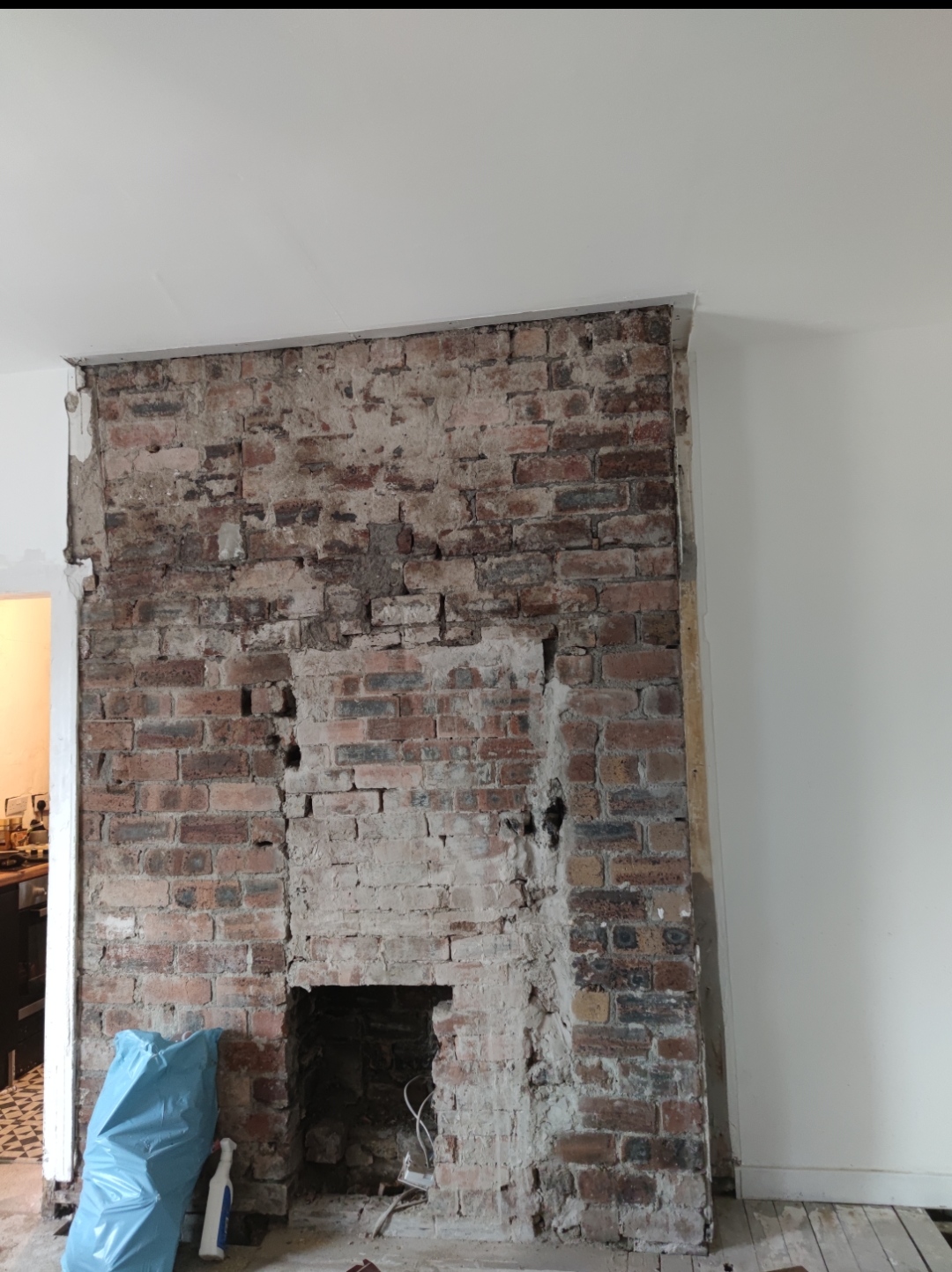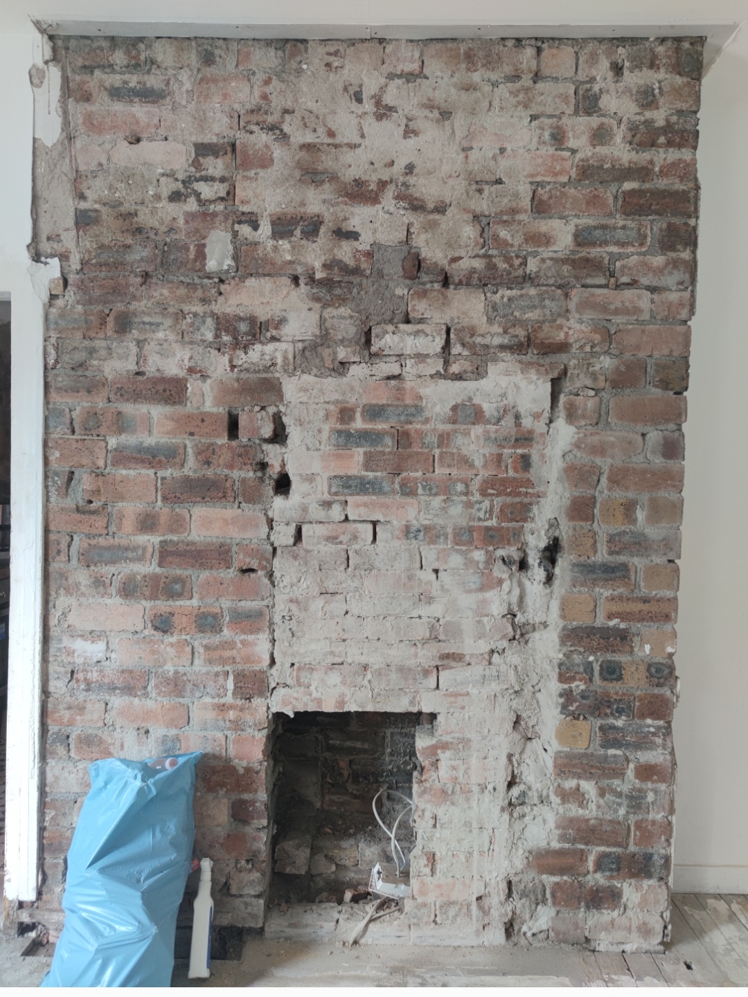 I'm hoping to get some opinions on what you think may be going on here. This wall was hidden behind a plasterboard frame and it looks like there's been some damage at some point - there's no obvious lintel just the chimney plate (or does that double as a lintel?)