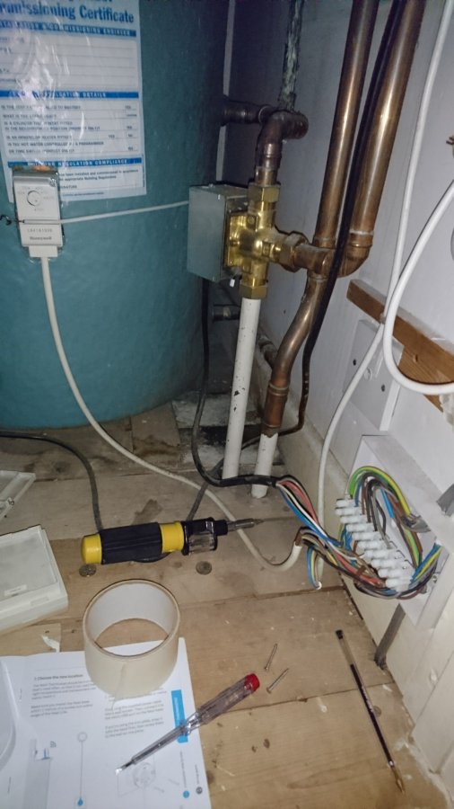 This is all upstairs in the airing cupboard with my boiler in the loft. There appears to only be one collection of wires coming "up" into the junction box but the colours do not match those leaving the thermostat.