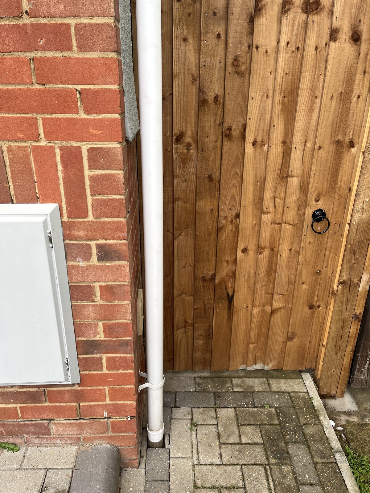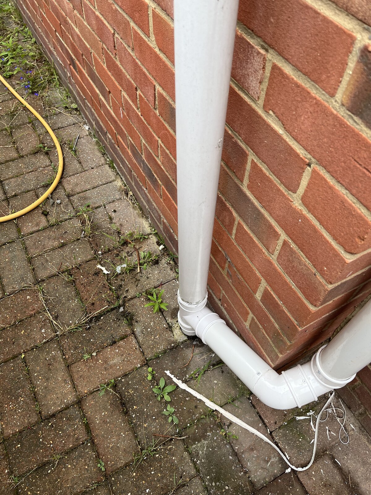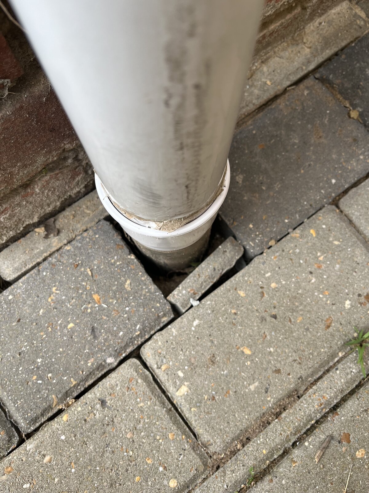 I’m really struggling to understand our home’s gutters. We are end-of-terrace, with one downspout in the front. It’s the single pipe that goes into the grey bricks in front of the fence. I pulled it out yesterday and discovered that it just goes about 12 inches into sandy soil under the brick. It does seem to drain and I haven’t seen signs of water damage, but still it’s odd. Is it a soakaway and if so why is it so close to the house?