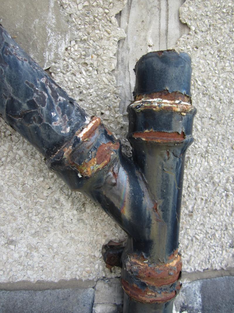 Hi all. My scaffolders pulled off a section of the iron soil stack. In fairness it was in poor condition. I've just been up the ladder to have a look. There's a short section that joins at the 'Y'. I thought it was all cast iron, but looking closer it's quite badly dented, so it may be hard to cut back to a section that's properly circular. It feels metallic when I tap it. The pipe appears to be a single piece (no joins) that does a 90 degrees in to the wall. I'd prefer not to replace the through-wall bit. Questions: