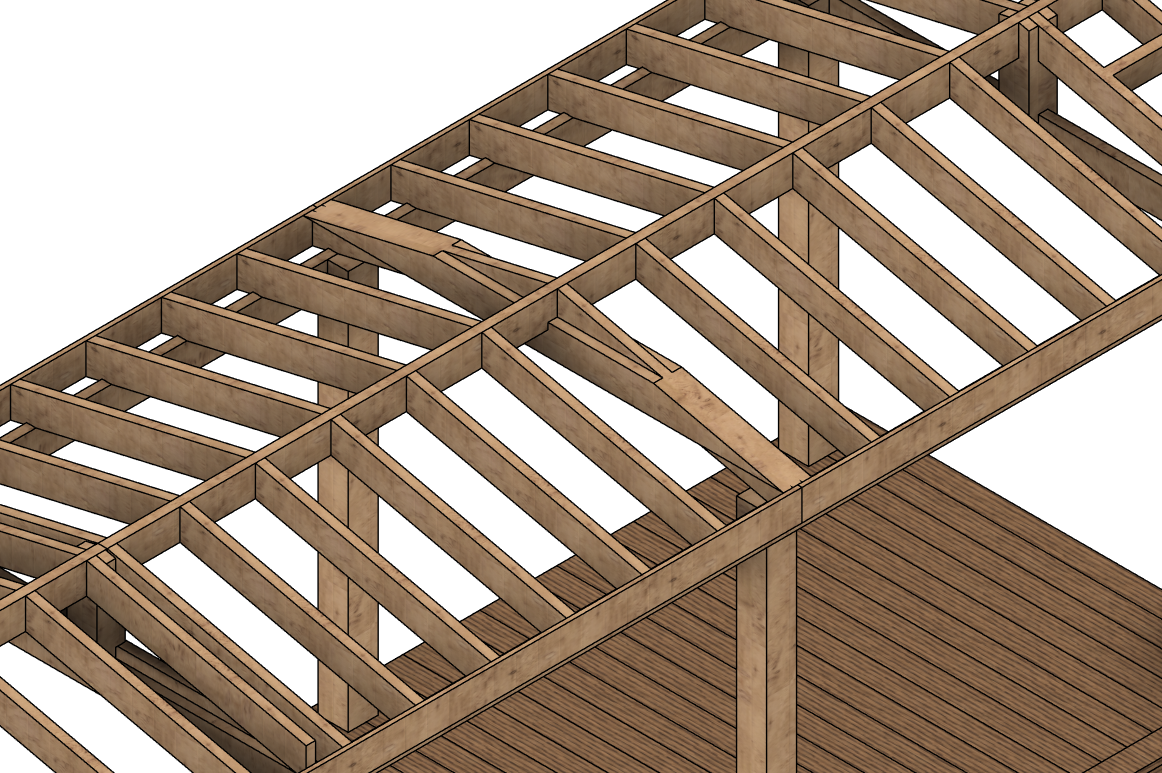 The third set of posts from the left will hold a table and chairs, so I avoided a joist across to the next post to keep it clear. Instead, I’ve joined the two rafters with 2 x 47mm x 150mm timbers. I’d like to know if this fix is structurally sound. Please check my attached plans for details.
