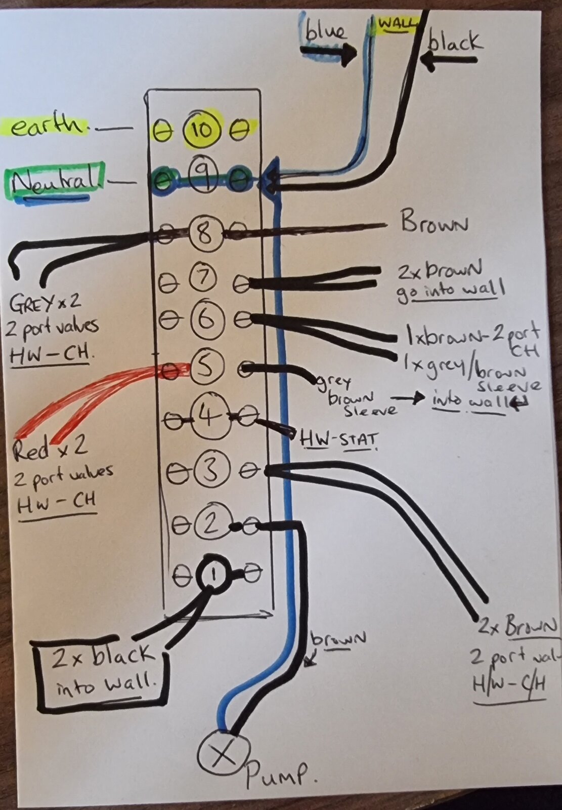 Yeah the grey with brown sleeving comes from programmer/timer up to wiring center block no.6 to 2 port valve heating