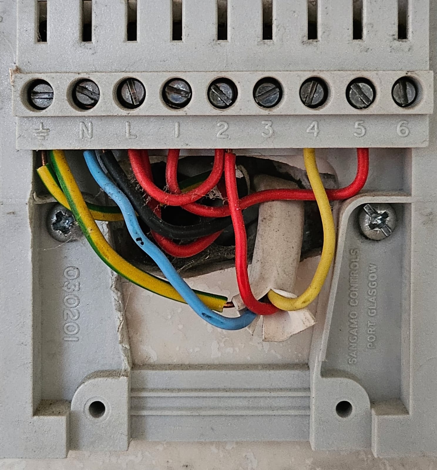 It would seem the red, yellow, blue cable is cable to boiler, seems a little odd as both sets of contacts seem to be used, so I would want to test to be sure, however would expect to find blue = neutral, Red = permanent line, and yellow switched line.