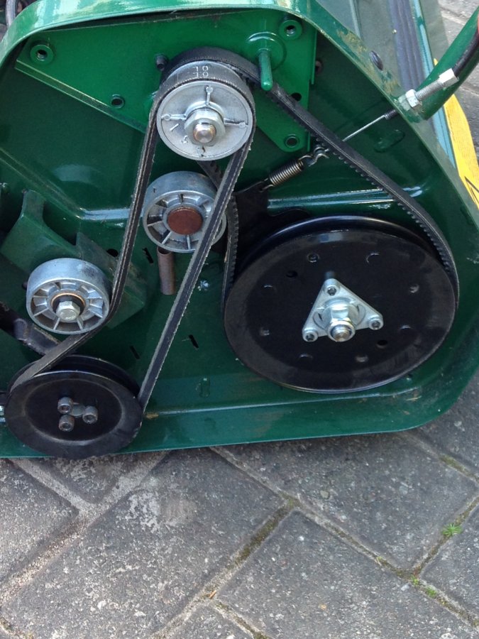 I came across this mower when I moved into my new house before Christmas. Now, it's time to get out an have a good look at my garden, I thought I should have a look at seeing if I can get it working. I have my own mower to cut to the lawn, but always wanted to have a go at a cylinder mower. The lid was not fitted and after having a look ,it seems like something is not right. There is an odd feel to the tension on the pulleys and they seem to be fitted incorrectly. Also, there is a spring in the centre with one end attached, but the other just hanging. I can't see where it could possibly attach. Could any folk who know their way around a mower have a look at this picture and give me a few tips? Any advice would be greatly appreciated.