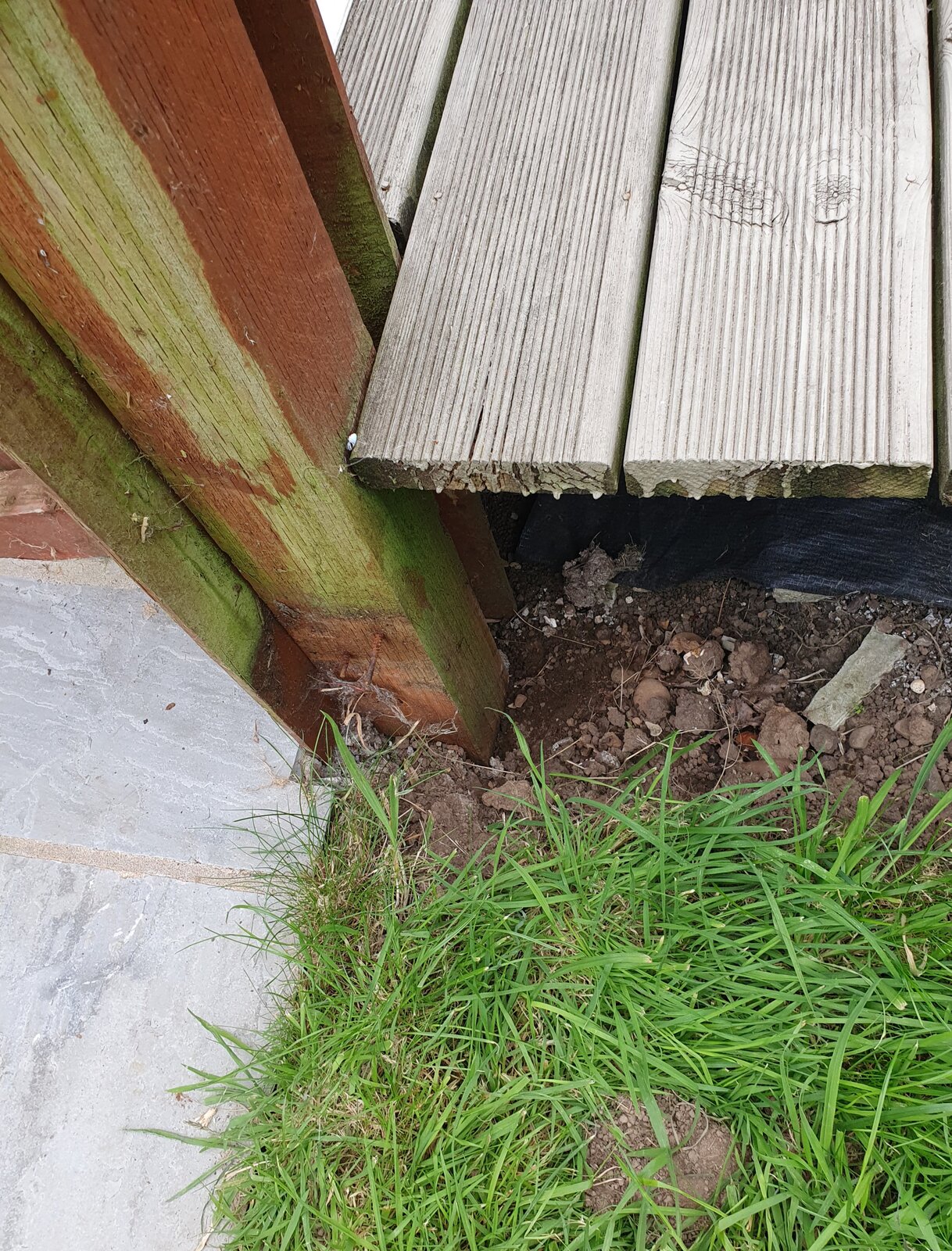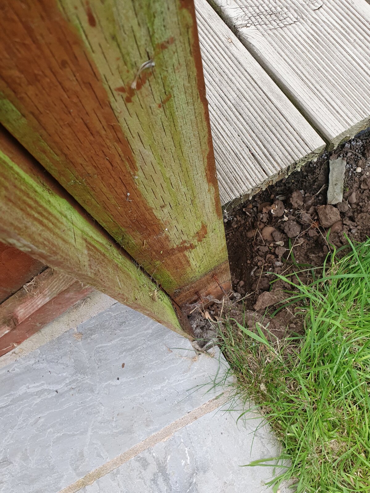 I've got one more post and look where it is. I had a new patio layed last year. The decking in the attached photos are my neighbours.