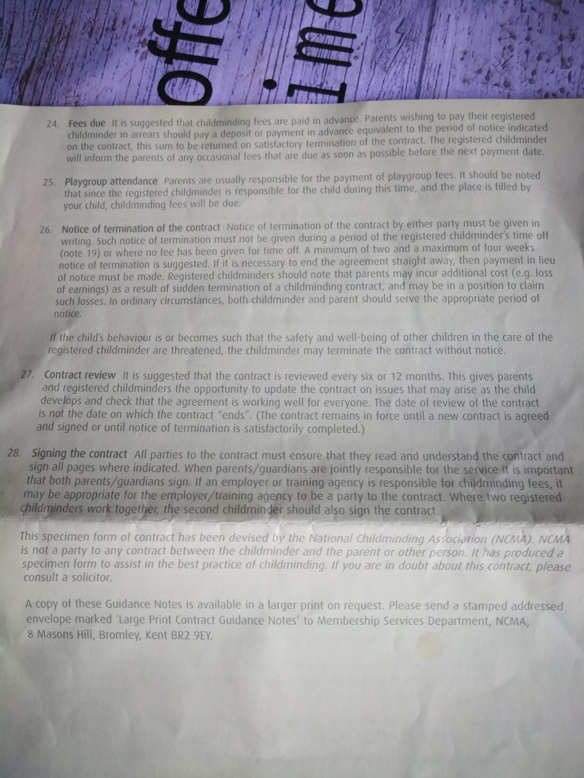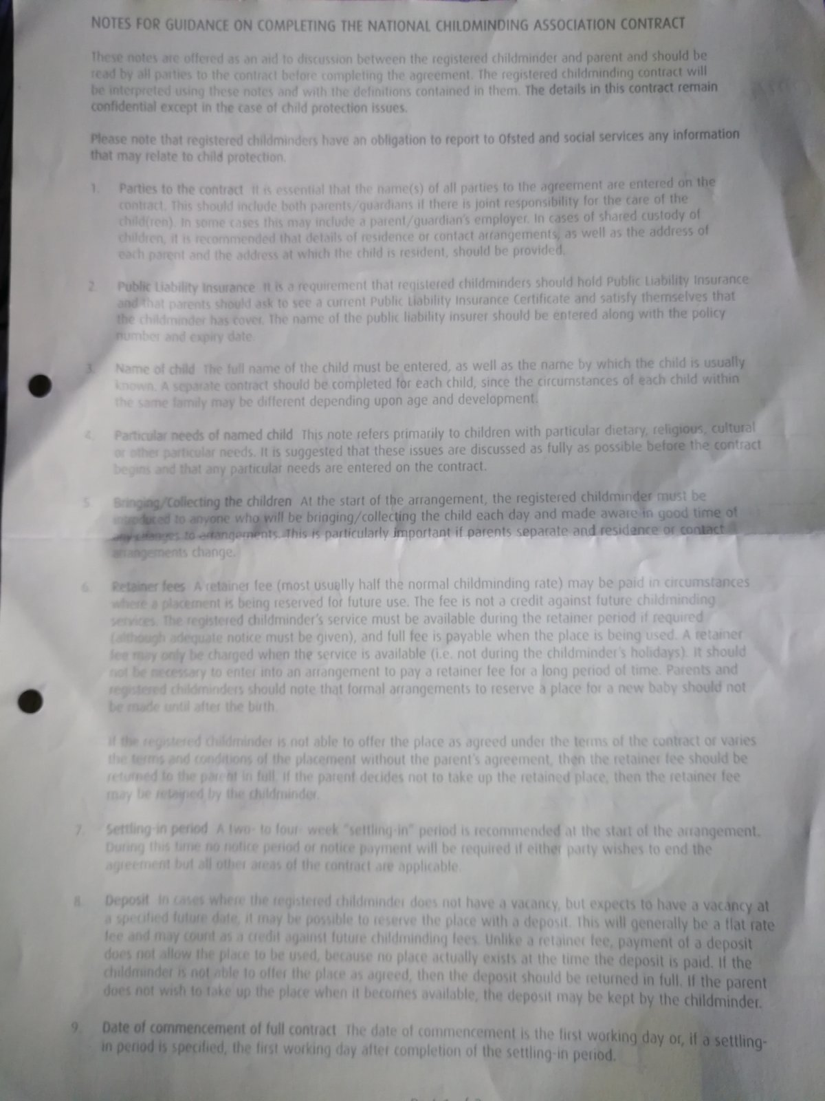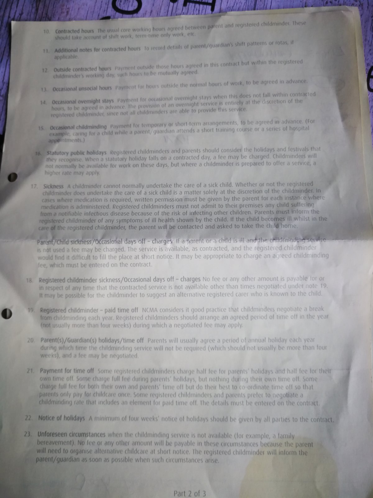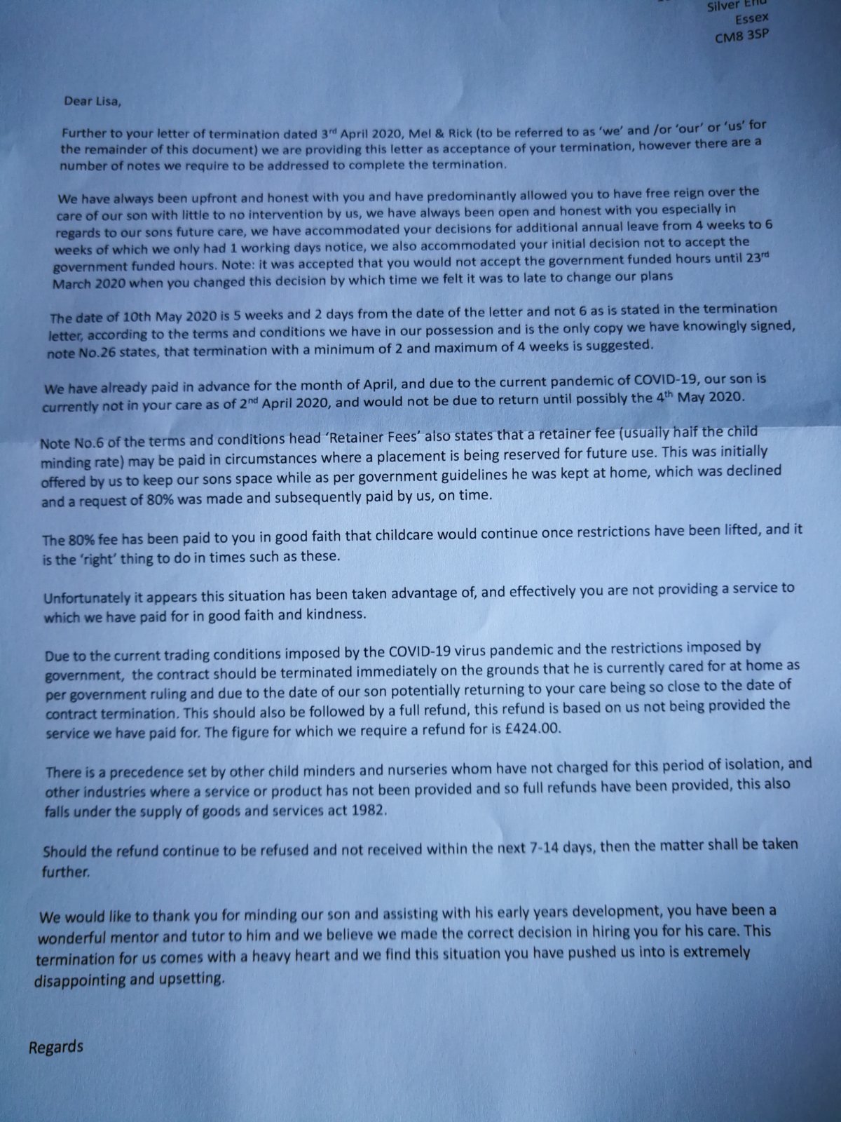 The child minder told us the service was no longer to be offered last night