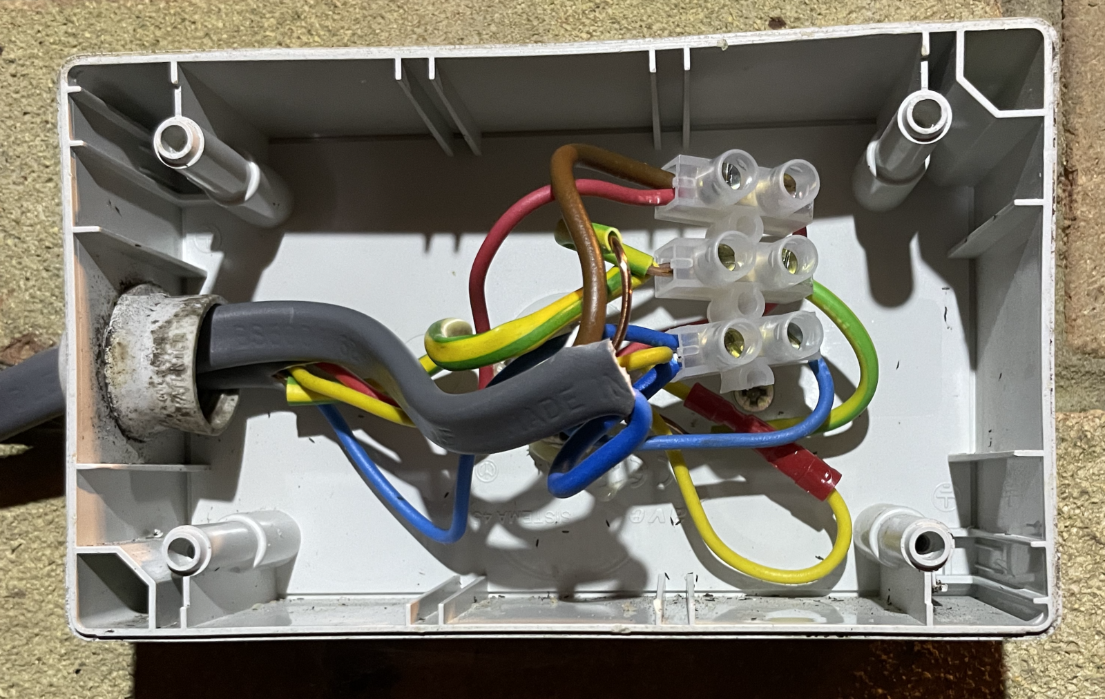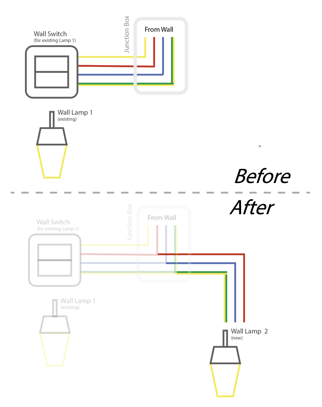 There is a pre-existing junction box which is wired coming from the wall to a switch box, which controls an existing wall light elsewhere. It has live, earth, neutral, and a switch wire.