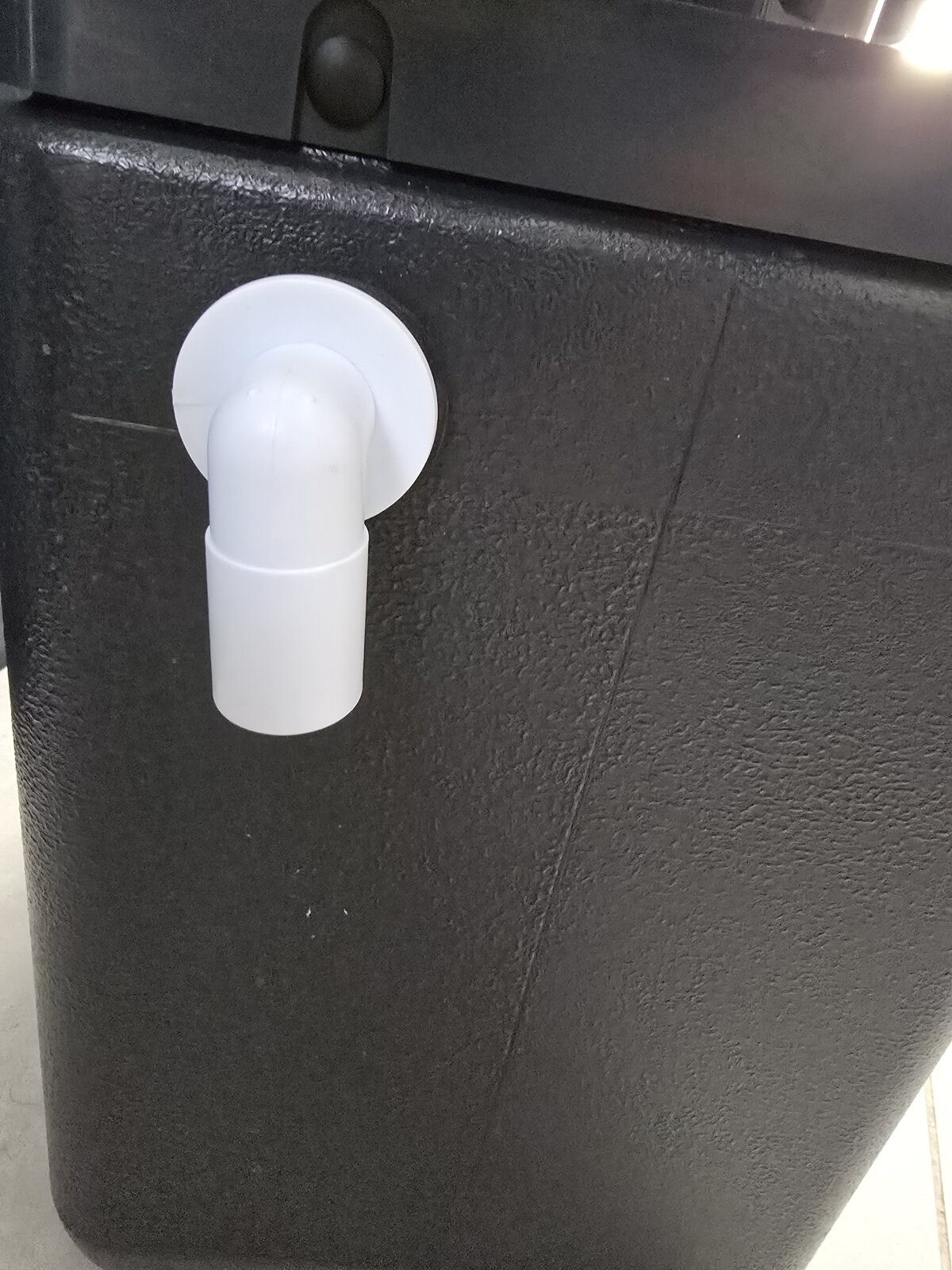 Hopefully a fairly straightforward question. I'd really appreciate some advice on the best way to connect the waste outlet from my water softener (as pictured) to the pvc pipe my kitchen fitter installed for me. I want to make the connected demountable if I ever need to change my softener and also to make it easy to pull out. Ideally there would be a way to connect the two using a rubber hose that I could connect and disconnect when I need to pull the softener out. Also the elbow in the waste pipe (picture 2) is not attached yet so it can be replaced.