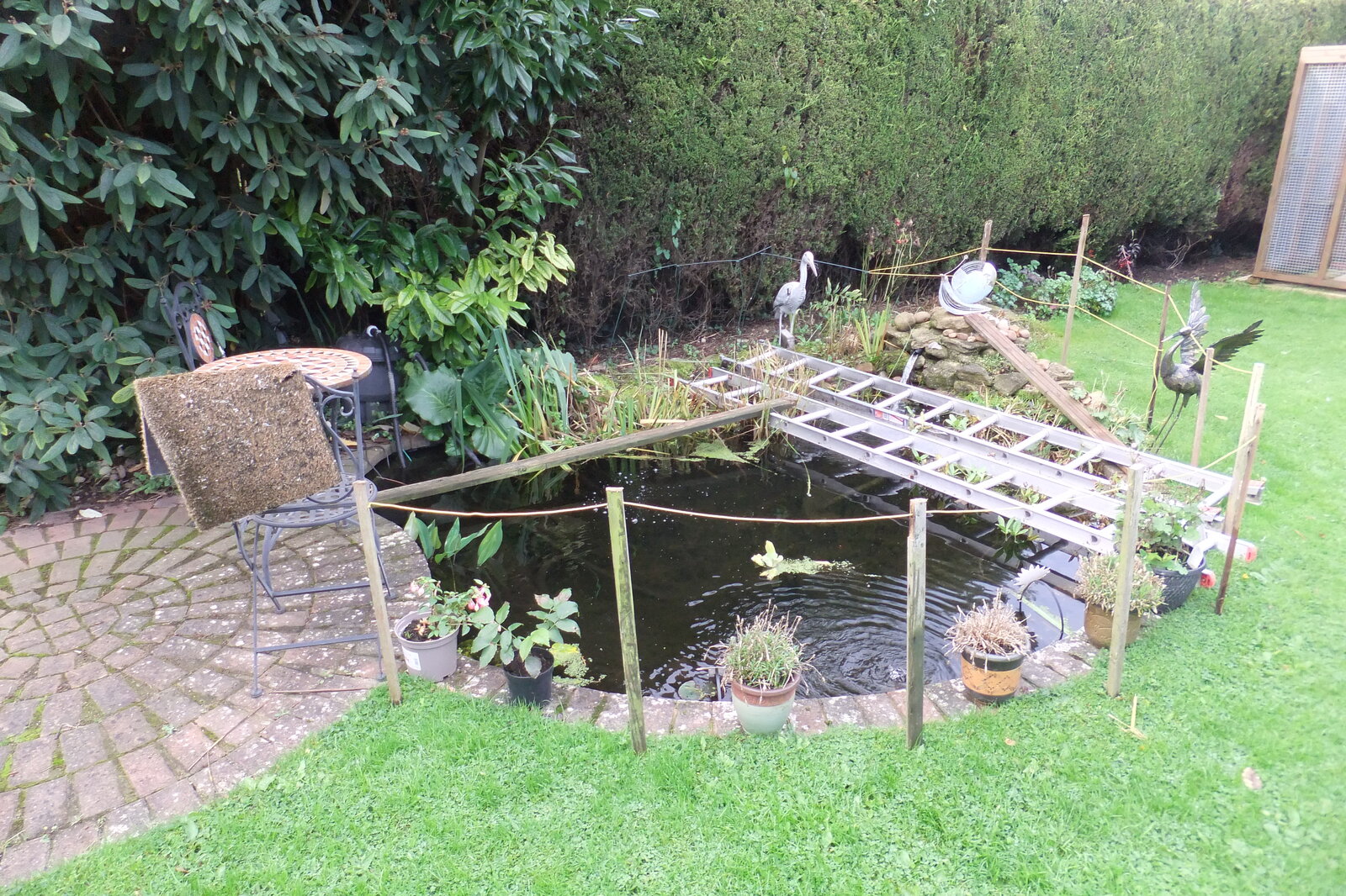 The pond should look like the first picture but after cutting the reed/iris/rushes back ( a mistake in retrospect) we had to take drastic action after the local bird spotted the goldfish. The stakes and rope seem to keep it away from the edge but this morning it was perched on the back of the chair, just waiting.