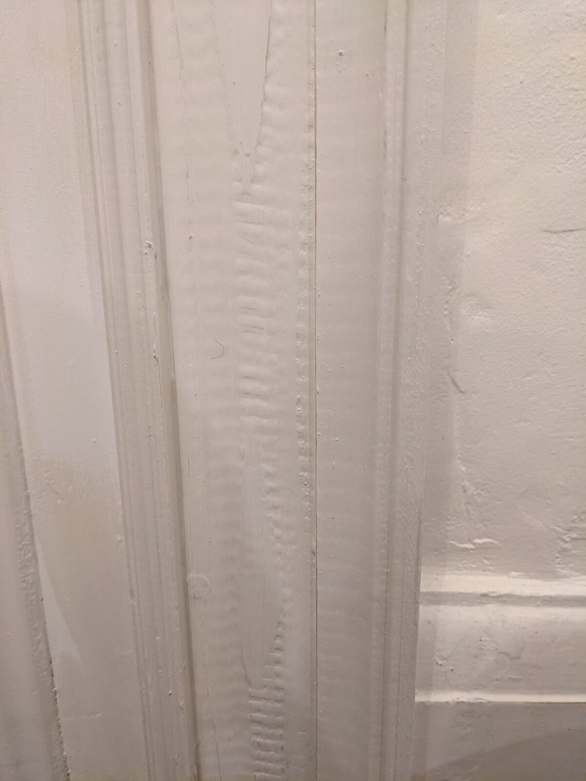 Re-Painting a fireplace front/surround. It is wood and would guess its pine because can see knots bleeding through in two spots. But the wood has a lot of wavy texture or pattern showing through old paint. Its not stain but uneven texture. I attach a pic and hope that will help to explain. At another spot you can see and feel the pine's ring-like pattern too - this doesnt bother me much. But this wavy texture seems like wood piece wasnt plained before installing!!