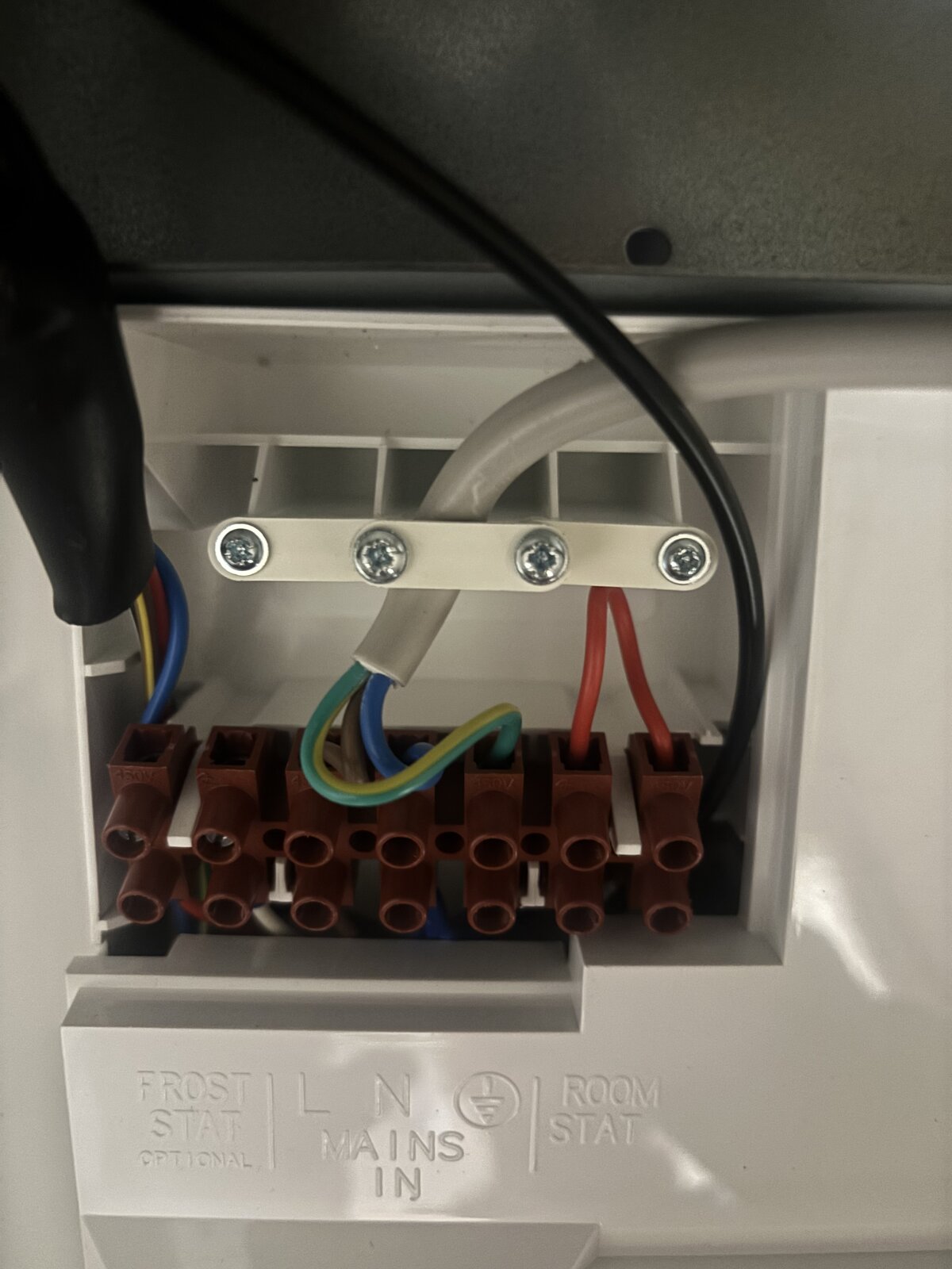 Hi there. I have a Morco GB2 Series 3 Combi boiler in my caravan. I was wondering what the connections to the Hive receiver should be made from the boilers electrical panel. I have attached the photo of the current connection at boiler. The red linked wire is connected into the Room Stat. The boiler has a mechanical timer on front and I currently have no existing thermostat in the caravan. I am using 4 core and earth heat resistant cable to connect between the Hive receiver and boiler Live, Neutral and Earth terminals. The boiler power is fed from a switched 13 amp wall mounted plug.