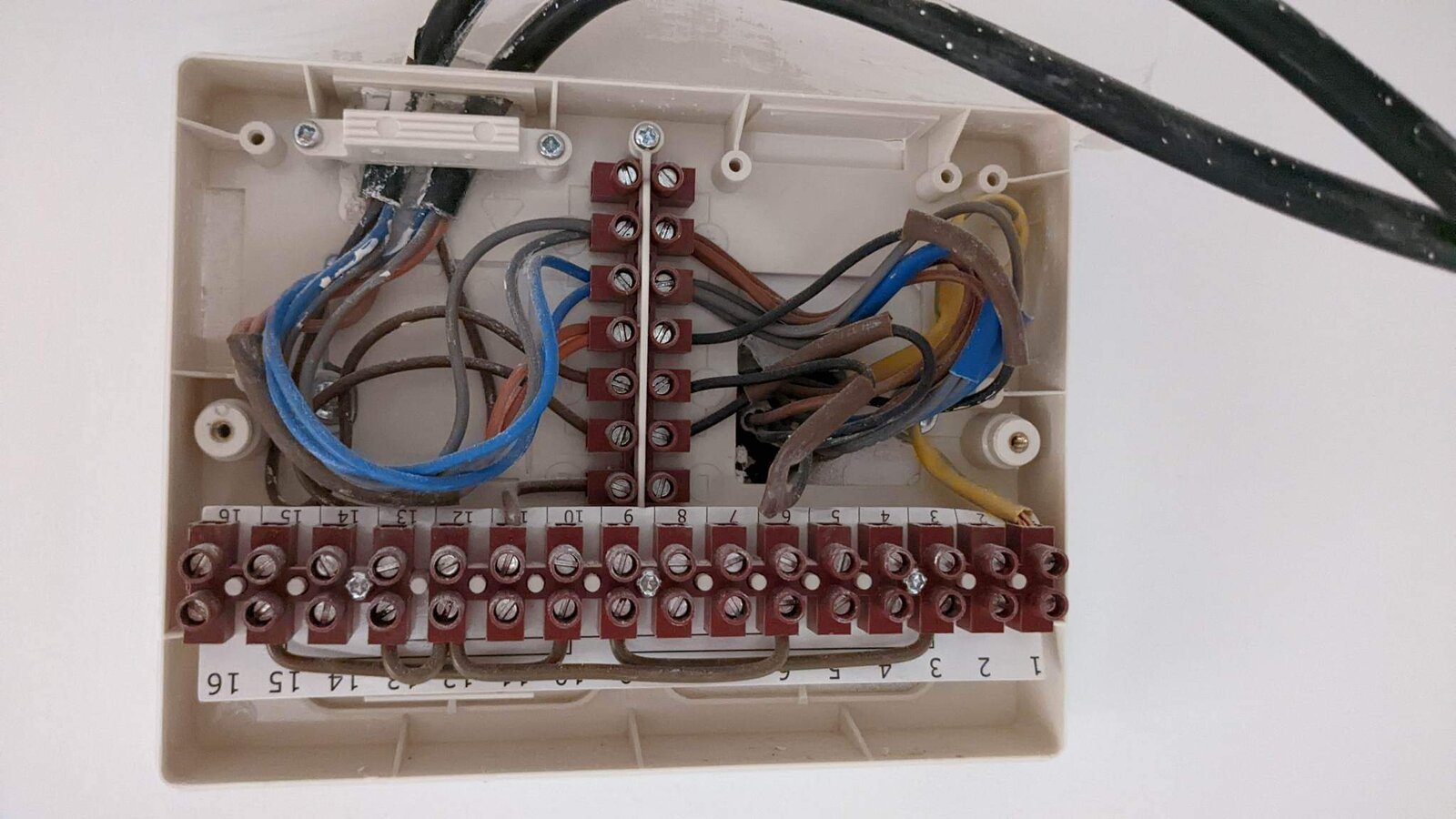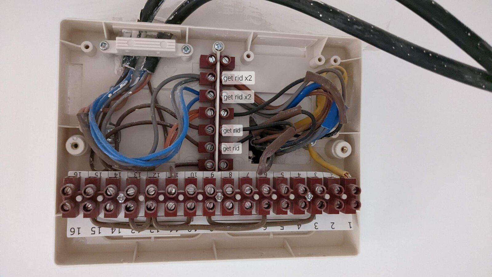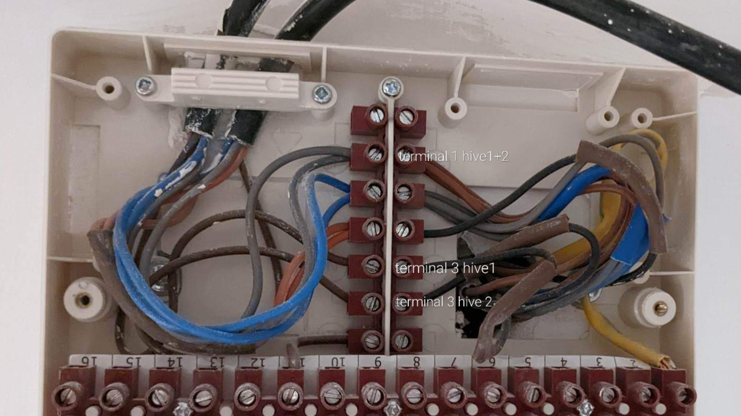 The brown wires going out to the thermostat are also in the terminal with the top arrow, and the black wires coming back from the thermostats are those going to the two motorised valve brown wires lower down, should you wish to remove the existing thermostat cables from the wiring centre and install new ones to the Hive receivers.