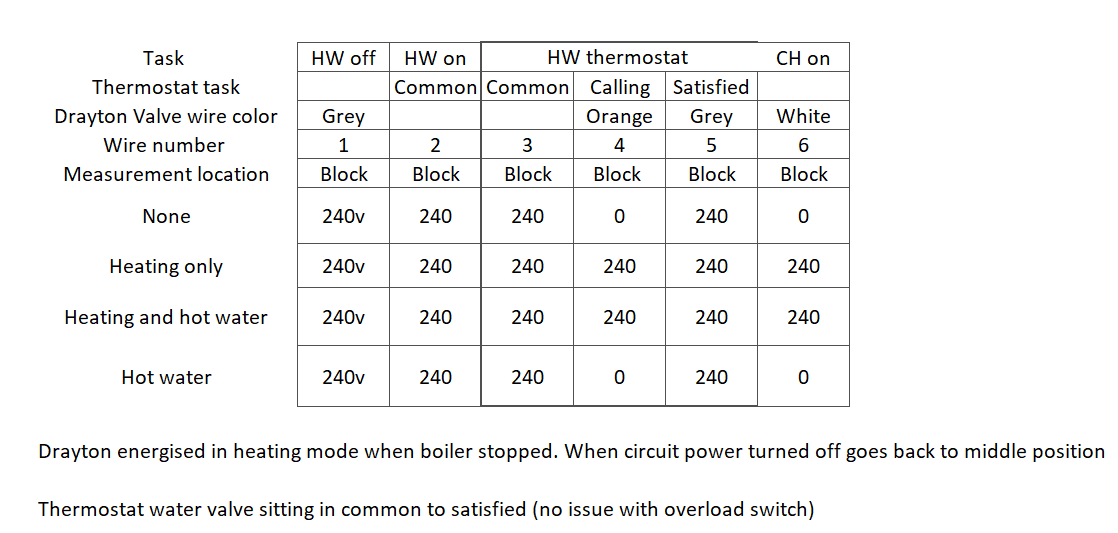 1st table shows the voltages at each position. Issue seems to be on the HW off from the hive dual receiver always at 240v, my thinking this is not correct. I disconnected this cable from the block as feedback from the valve etc could be causing this but there is 110v here when calling for hot water.