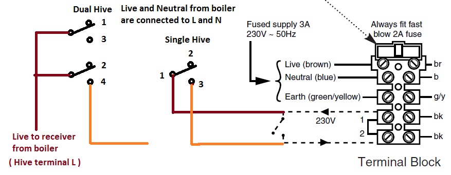 A question, Is the 230 V supply on Terminal 1 of the terminal block permanently connected or is it switched ON and OFF by safety devices ? Reason for asking is that if it is switched OFF by safety devices to prevent the boiler operating then the permanemt Live for the receiver in the Dual Channel Hive would by-pass those safety device when the Hive was calling for Heating.
