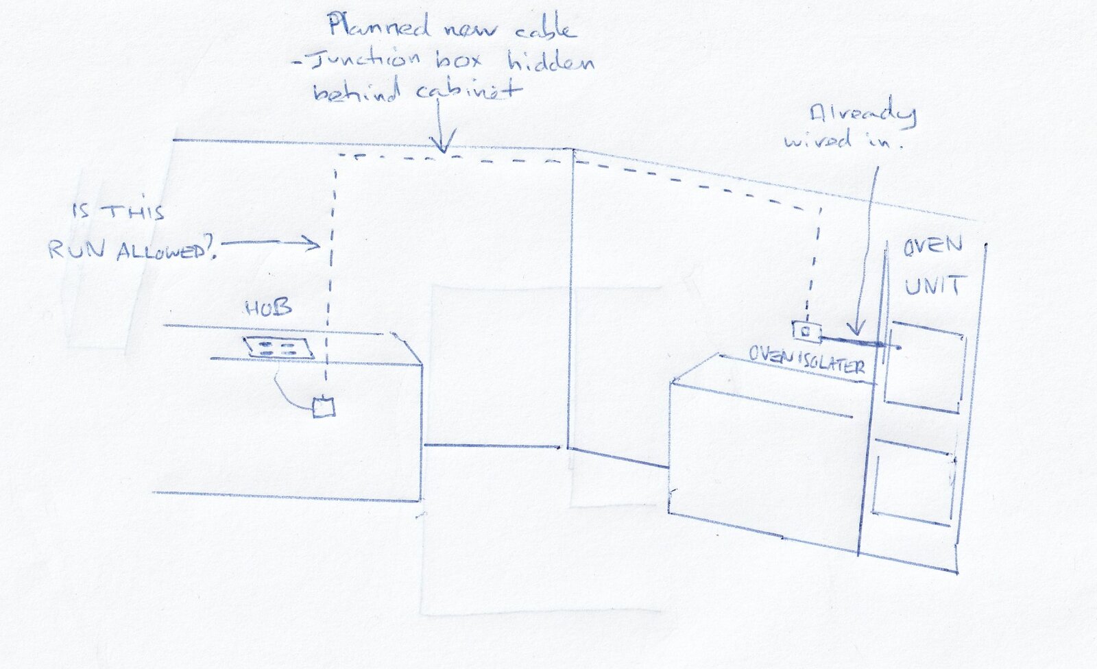 I want to change a gas hob to electric. The Main oven isolator switch is above a nearby worktop so I 'd like to run a 6mm cable up from this along the top of the wall in the permitted zone and then down by the hob to a connection unit behind a base uinit. The wire will go vertically down to this box so I guess be within the permitted zone but as the box will be out of sight does this still comply? (obviously no one will guess the cable is there)